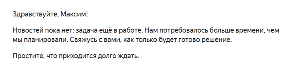 Решили сначала двигаться по первому, более простому пути. Параллельно отправили запрос в поддержку Яндекса. В течение месяца в ответ приходили стандартные письма: