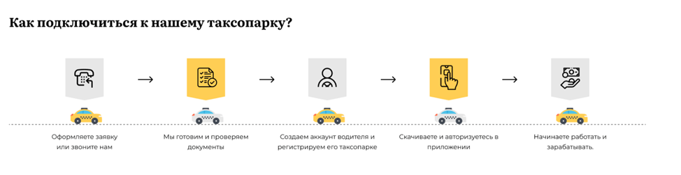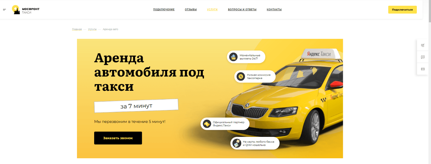 Клиент: сайт московской службы такси с собственным автопарком. Таксопарк сдает машины в аренду, сотрудничает с агрегаторами пассажирских перевозок и курьерскими сервисами.