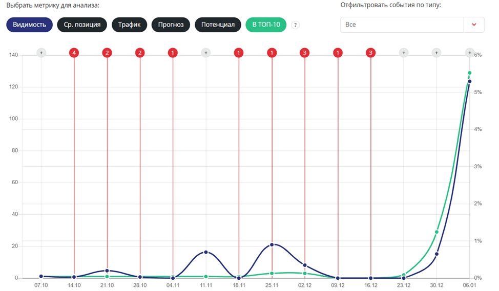 Мониторинг видимости, позиций и других SEO-параметров мы проводим в модуле ведения проектов Пиксель Тулс https://tools.pixelplus.ru/projects/ — комплексном сервисе аналитики. В кейсе использованы скрины из SEO-модуля.