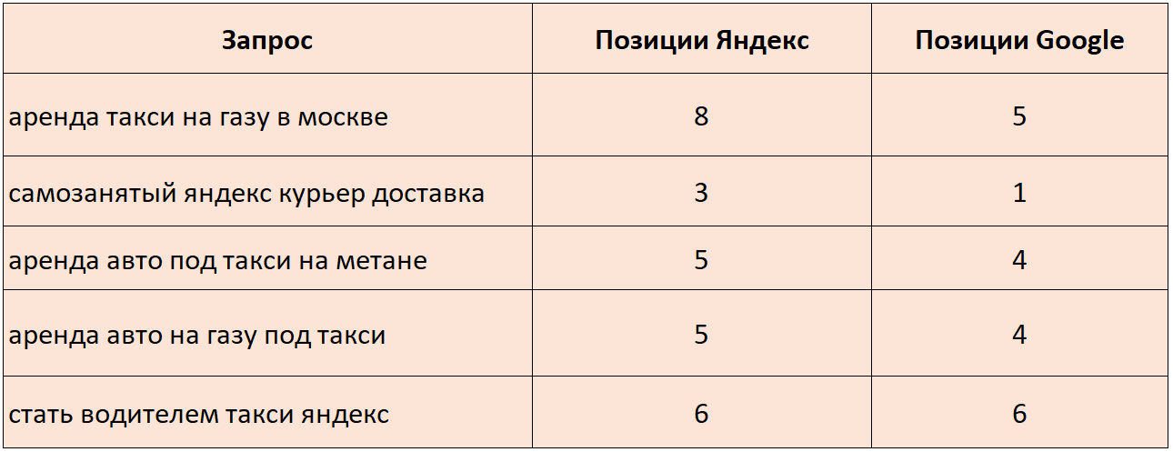 Проект занимает ТОП-10 Яндекса и Google по целевым запросам в тематике «Такси», вот часть из них:
