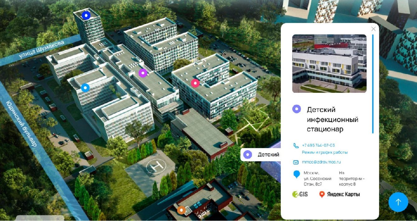 На главной странице сайта — интерактивная карта территории медицинского центра. По клику на здание появляется его карточка, в которой есть информация: что это за подразделение, как с ним можно связаться и какие часы работы, а также какие отделения внутри.