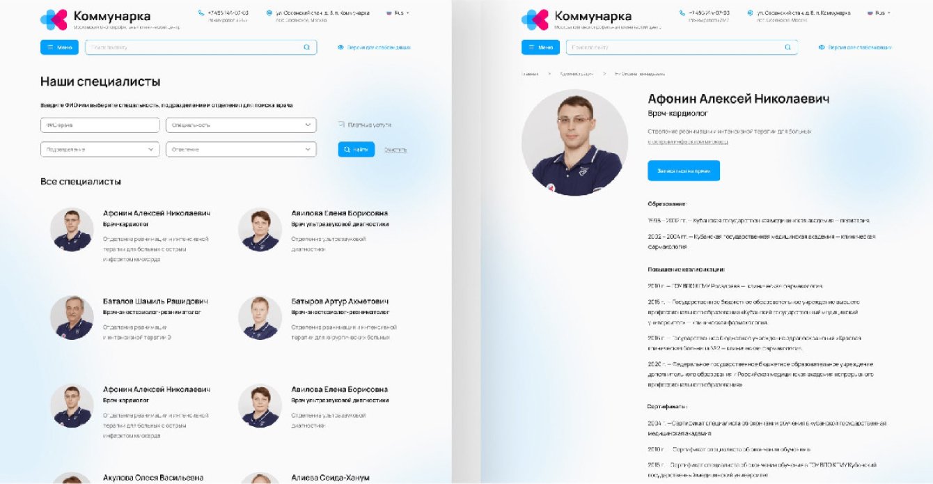 Детально проработали форму поиска специалиста среди перечня из 2000+ врачей, медсестер и других работников клинического центра, На странице с поиском специалиста мы предусмотрели фильтр с 4 параметрами и поиск по ФИО.