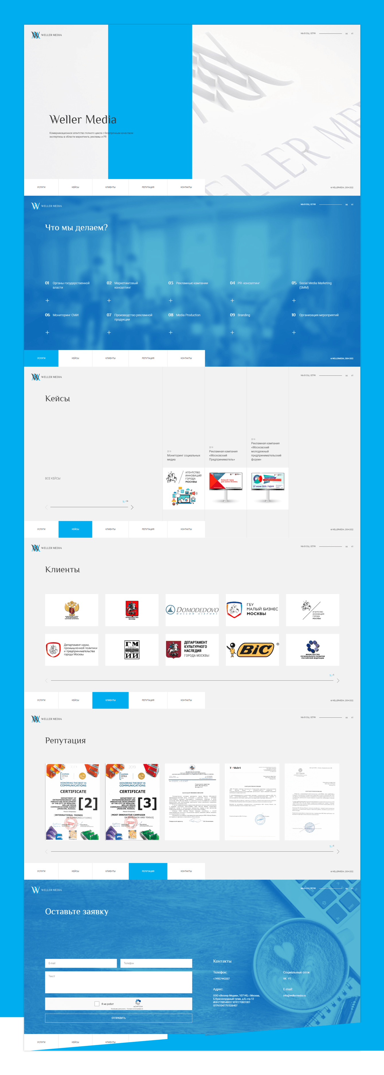 • Адаптивная вёрстка по технологии Full Page Scroll;