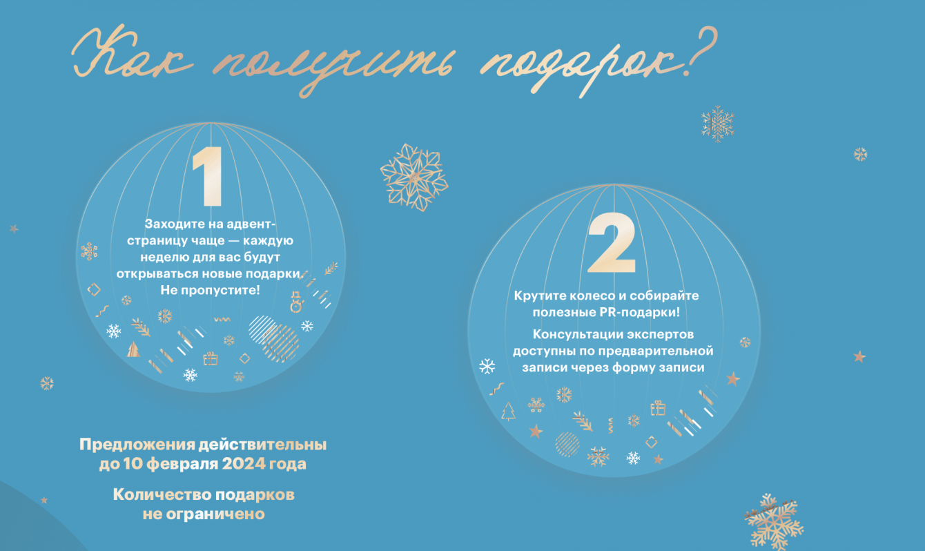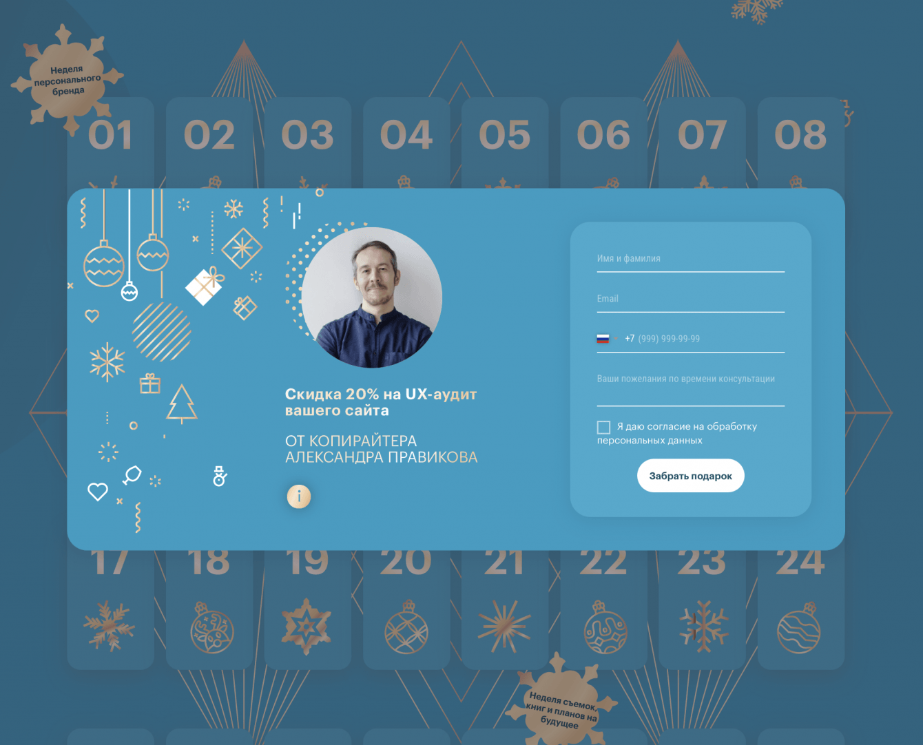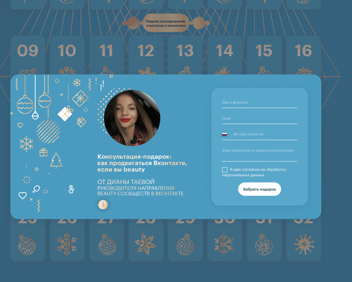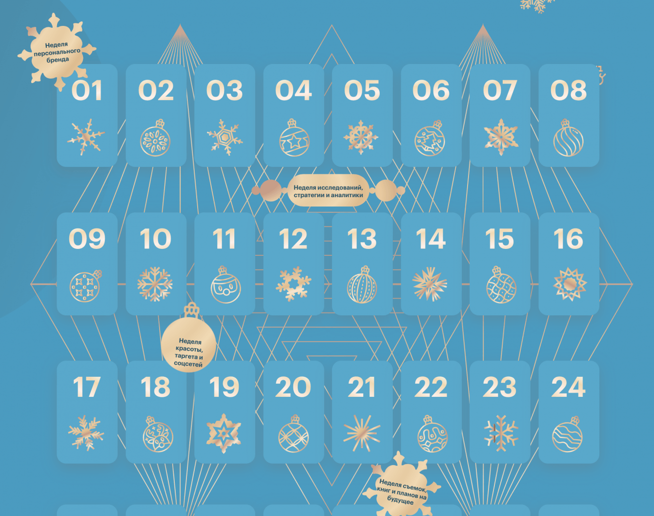 Разработали лендинг в формате виртуального адвент-календара с набором услуг, в котором собрали экспертизу топовых профи своего дела: аналитики, стратеги, коммуникаторы, маркетологи, дизайнеры, журналисты, блогеры и продюсеры. Доступ к адвент-календарю клиенты получали по специальному секретному коду, который они получали в e-mail-рассылке. 1 письмо в начале каждой недели в течение декабря.