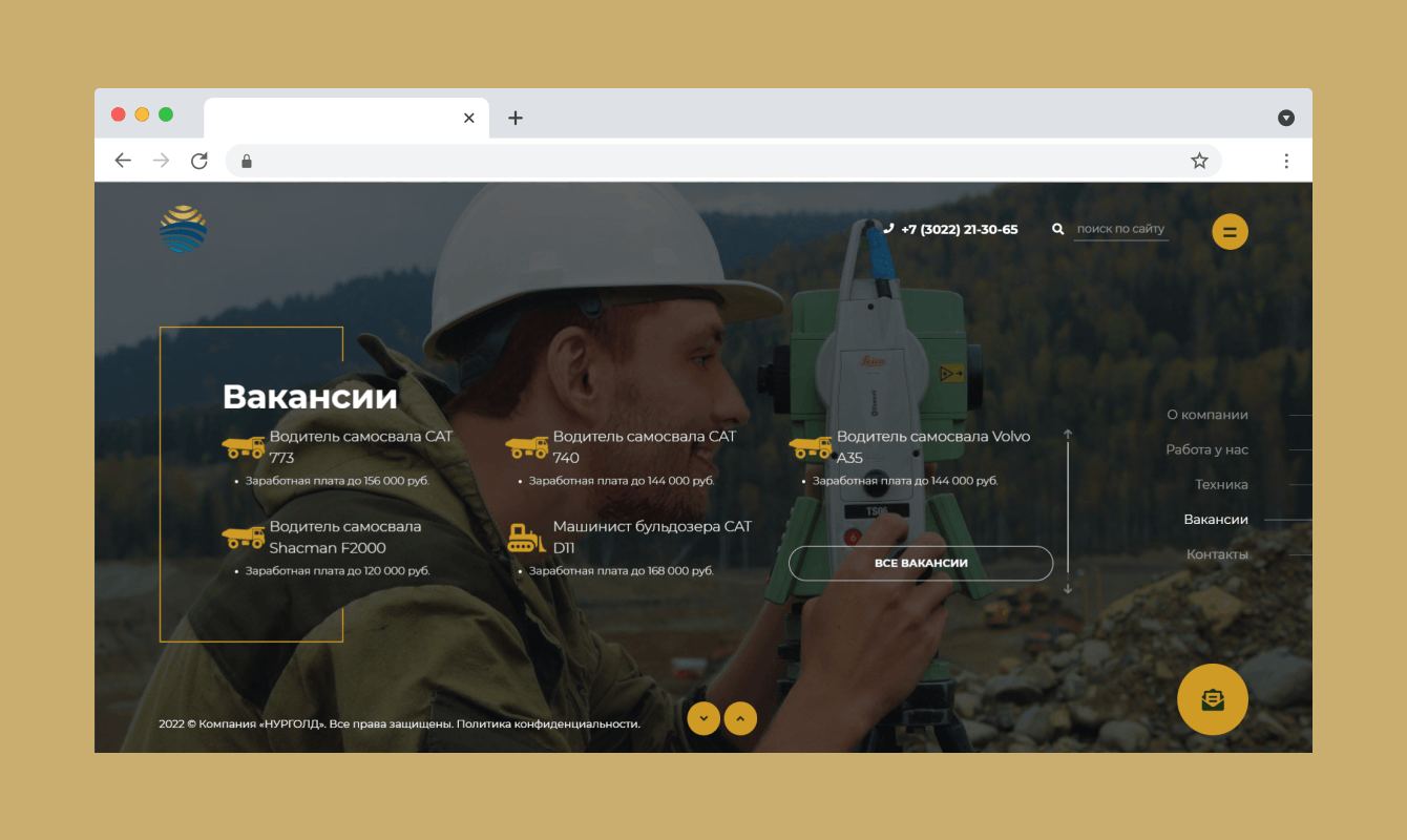 2. На сайте компании «Нурголд» представлен весь парк техники, к каждой модели добавлены описание и яркий фотоснимок, что сразу дает представление о масштабах проводимых работ, а потенциальные сотрудники видят машины, на которых им предстоит работать.