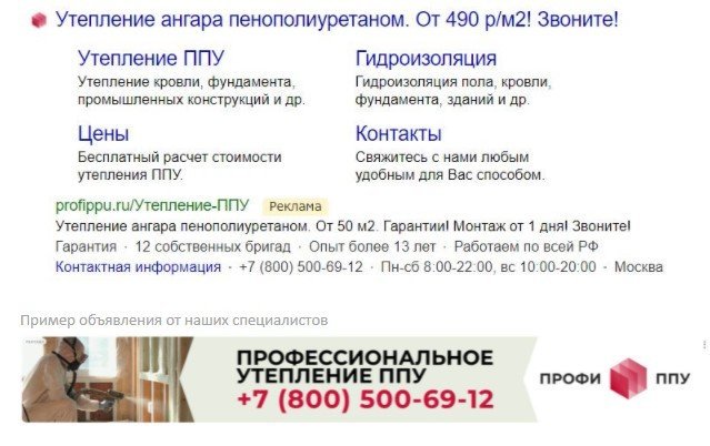 Исходя их полученных данных, мы определили на что делать упор в своих рекламных объявлениях, чем мы можем выделиться среди конкурентов. А именно: указали стоимость услуг, которая ниже, чем у конкурентов, опыт работы, дали конкретную информацию о сроках службы материалов, гарантиях на услуги и минимальном объеме заказа и т.д. Создали объявления с релевантными заголовками и посадочными страницами. Использовали все инструменты для составления объявлений (уточнения, дополнительные ссылки и пр.).