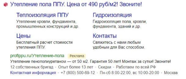 Исходя их полученных данных, мы определили на что делать упор в своих рекламных объявлениях, чем мы можем выделиться среди конкурентов. А именно: указали стоимость услуг, которая ниже, чем у конкурентов, опыт работы, дали конкретную информацию о сроках службы материалов, гарантиях на услуги и минимальном объеме заказа и т.д. Создали объявления с релевантными заголовками и посадочными страницами. Использовали все инструменты для составления объявлений (уточнения, дополнительные ссылки и пр.).