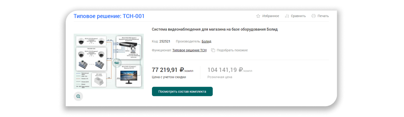 На странице каждого типового решения есть схема и состав комплекта оборудования с указанием цены как всего комплекта, так и каждой единицы оборудования. Пользователь может изменить количество оборудования в соответствии со своей задачей и оценить изменение стоимости проекта. Однако из комплекта нельзя удалить элементы, на которых основано типовое решение.