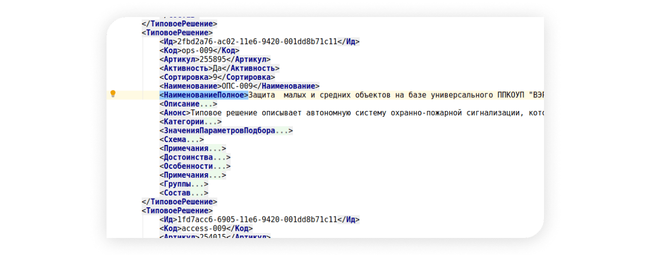Данные из XML-файлов импортируются в инфоблоки, аналогично прочим товарам. У типовых решений есть свойства, цены, перечень оборудования и вспомогательная мета-информация.