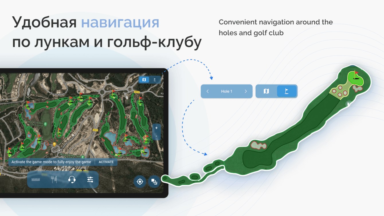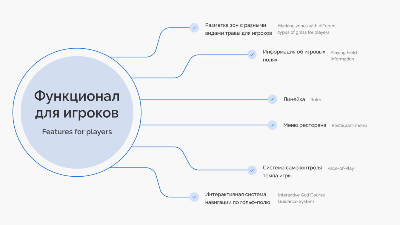 Функциональность приложения включает в себя линейку для расчета удара, контроль темпа игры, заказы из ресторана с доставкой на поле.