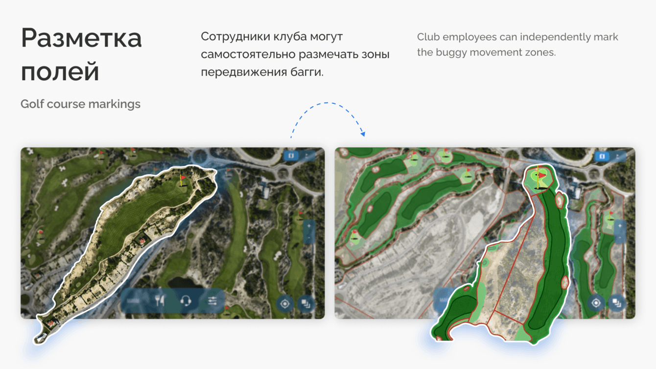 Данный инструмент позволяет сотрудникам гольф-клуба самостоятельно создавать и редактировать разметку территории. Это необходимо для осуществления контроля за передвижением багги.