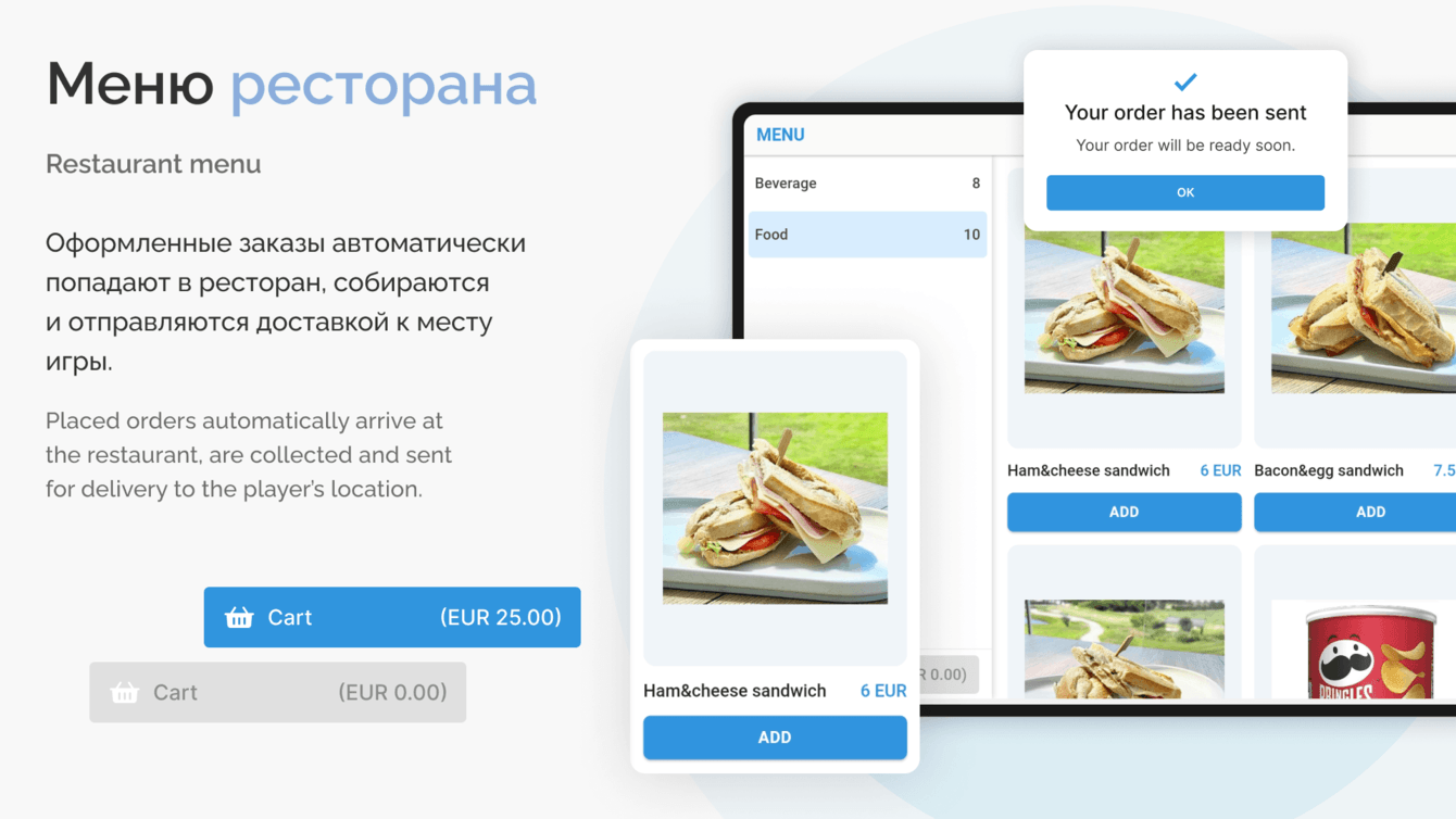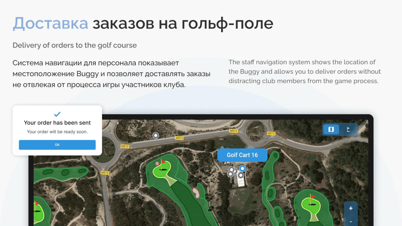 Участник может продолжать игру и не переживать, что заказанный напиток не будет доставлен, даже если покинуть игровую лунку и переместиться на новую. Разработанная система заказов и обслуживания позволяет игрокам не отрываться от игры на посещение ресторана, снижает вероятность появления очереди на лунке из-за прерывания игры, ускоряет процесс прохождения лунок и повышает лояльность участников клуба.