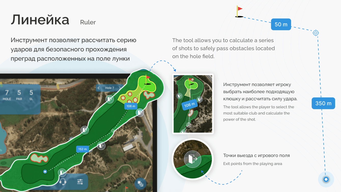 Для удобства игры мы встроили в приложение линейку. С помощью линейки можно рассчитать расстояние до лунки. Решение позволяет игрокам правильно подбирать клюшку, делать более точные удары и быстрее проходить все игровое поле. Данный инструмент востребован среди опытных игроков в гольф, которые знают и контролируют свою силу удара.