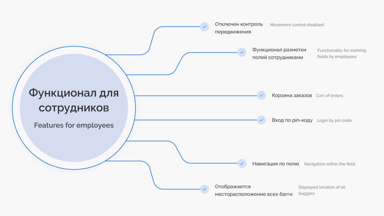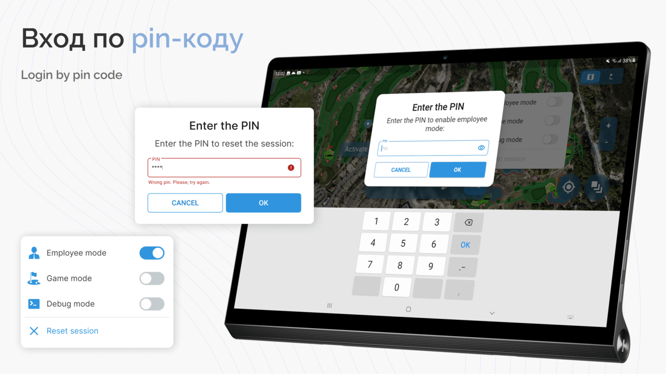Приложение предоставляет расширенный функционал для сотрудников, который снимает ограничения по передвижению багги, а также открывает доступ к режиму разметки полей. Для входа в систему необходимо ввести персональный PIN-код.