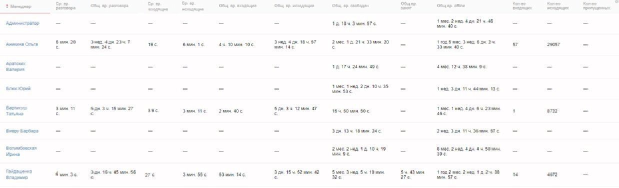 Отражается: среднее время разговора, общее время всех разговоров, средняя длительность входящих звонков, средняя длительность исходящих звонков, сумма длительности всех входящих, сумма длительности всех исходящих, общее время не на линии (не в разговоре), общее время offline, общее время занятости, количество входящих, исходящих и пропущенных звонков. За любой период.