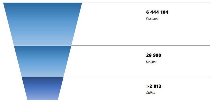 За время оказания услуг по проведению рекламной кампании программ Школы дизайна НИУ ВШЭ специалистам RuNetSoft было привлечено 28 990 переходов на страницы клиента и более 2 013 лидов. Таким образом, первоначальные требования к количеству лидов были перевыполнены в 4 раза, а требования к количеству переходов почти в 2 раза! Общая воронка кампании представлена на рисунке ниже.