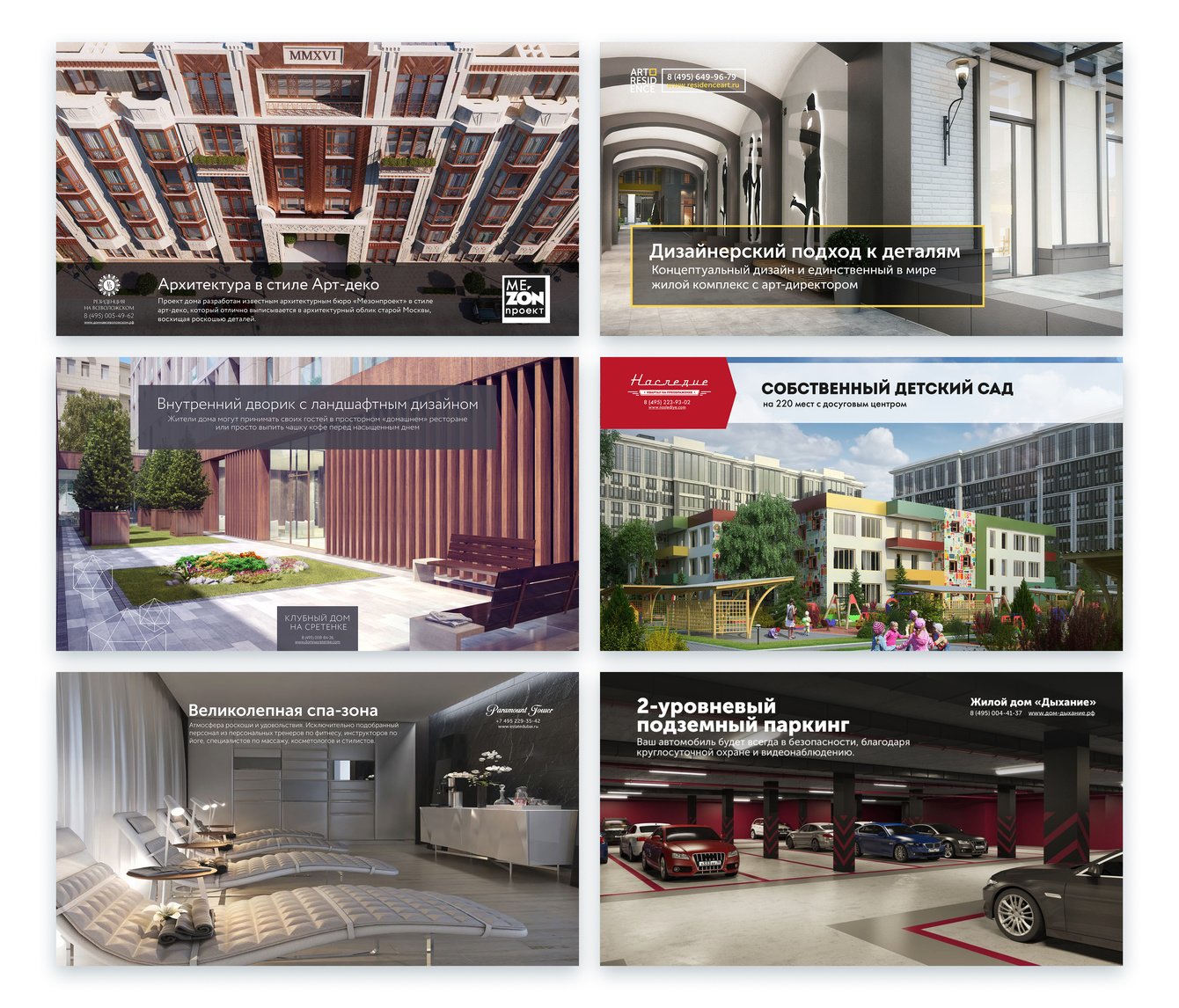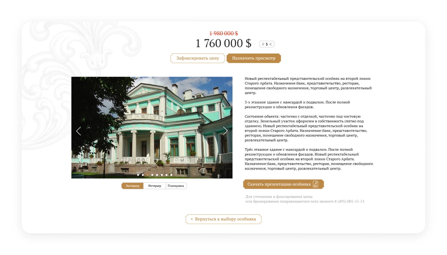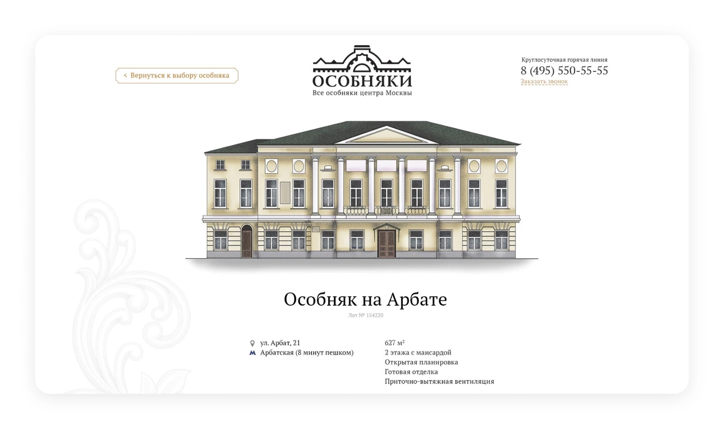 Выстроили целую систему, основанную на предоставлении клиенту информации в удобном формате — то, чего ранее не замечали на рынке. Вместо высокопарных рекламных текстов мы сфокусировались на фактуре: тщательно изучали каждое здание — этажность, материалы отделки, архитектурные особенности, и собирали эти данные на посадочных страницах, оформленных в стилистике конкретного объекта.