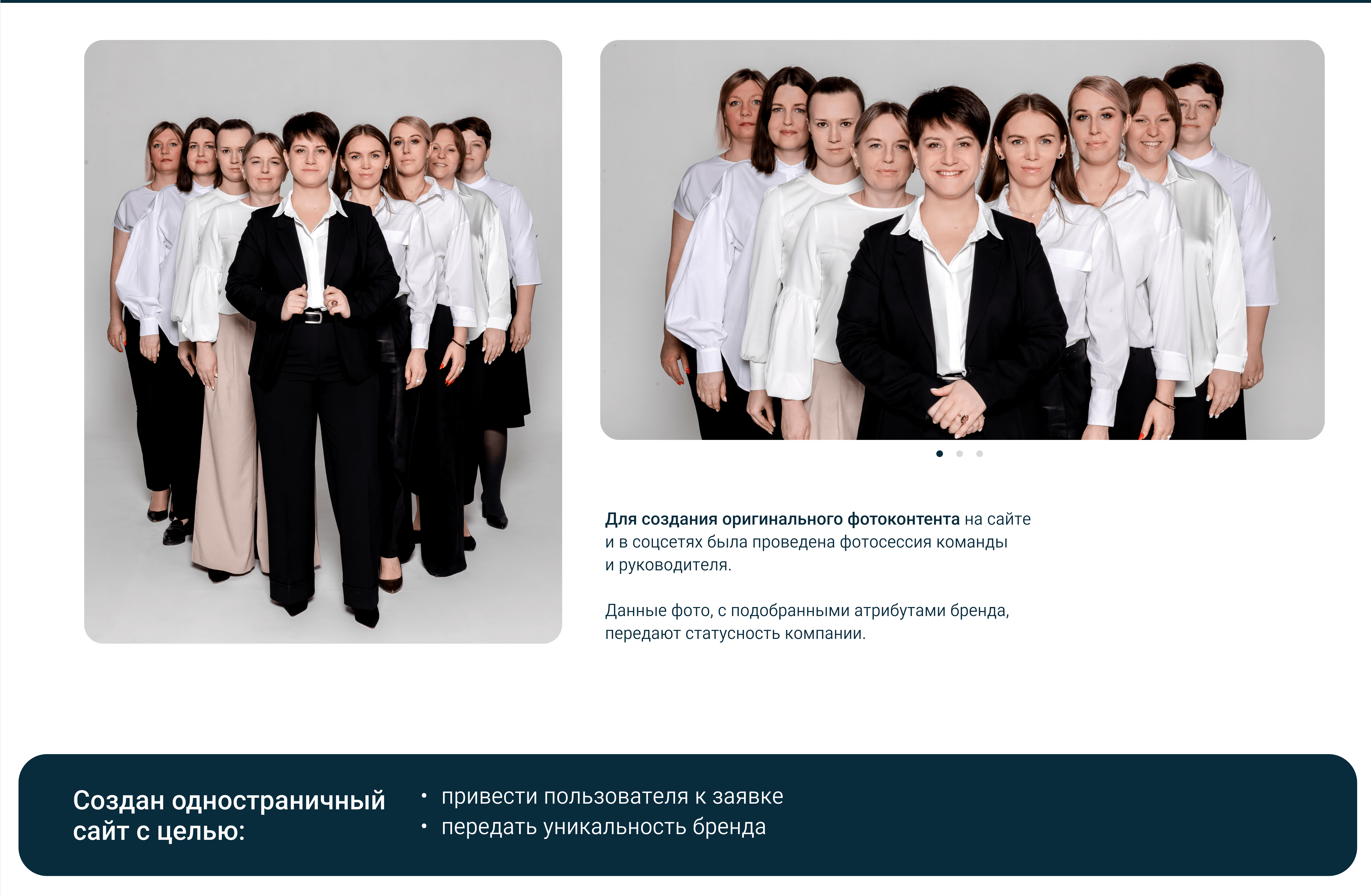 Провели профессиональную фотосессию команды и руководителя с атрибутами бренда, чтобы передать статусность и экспертизу.