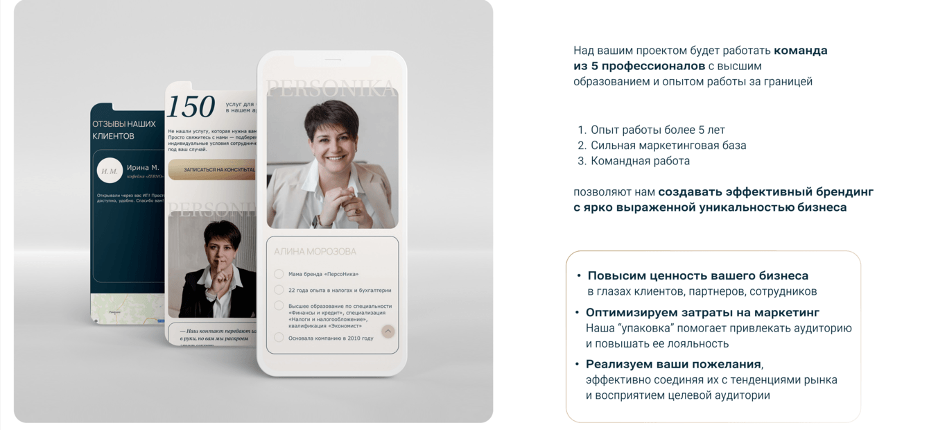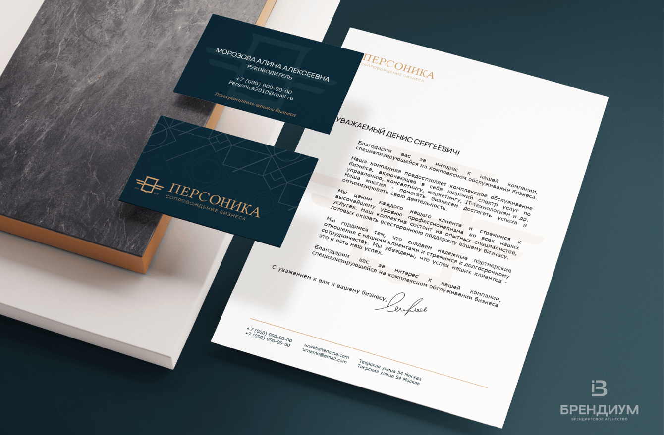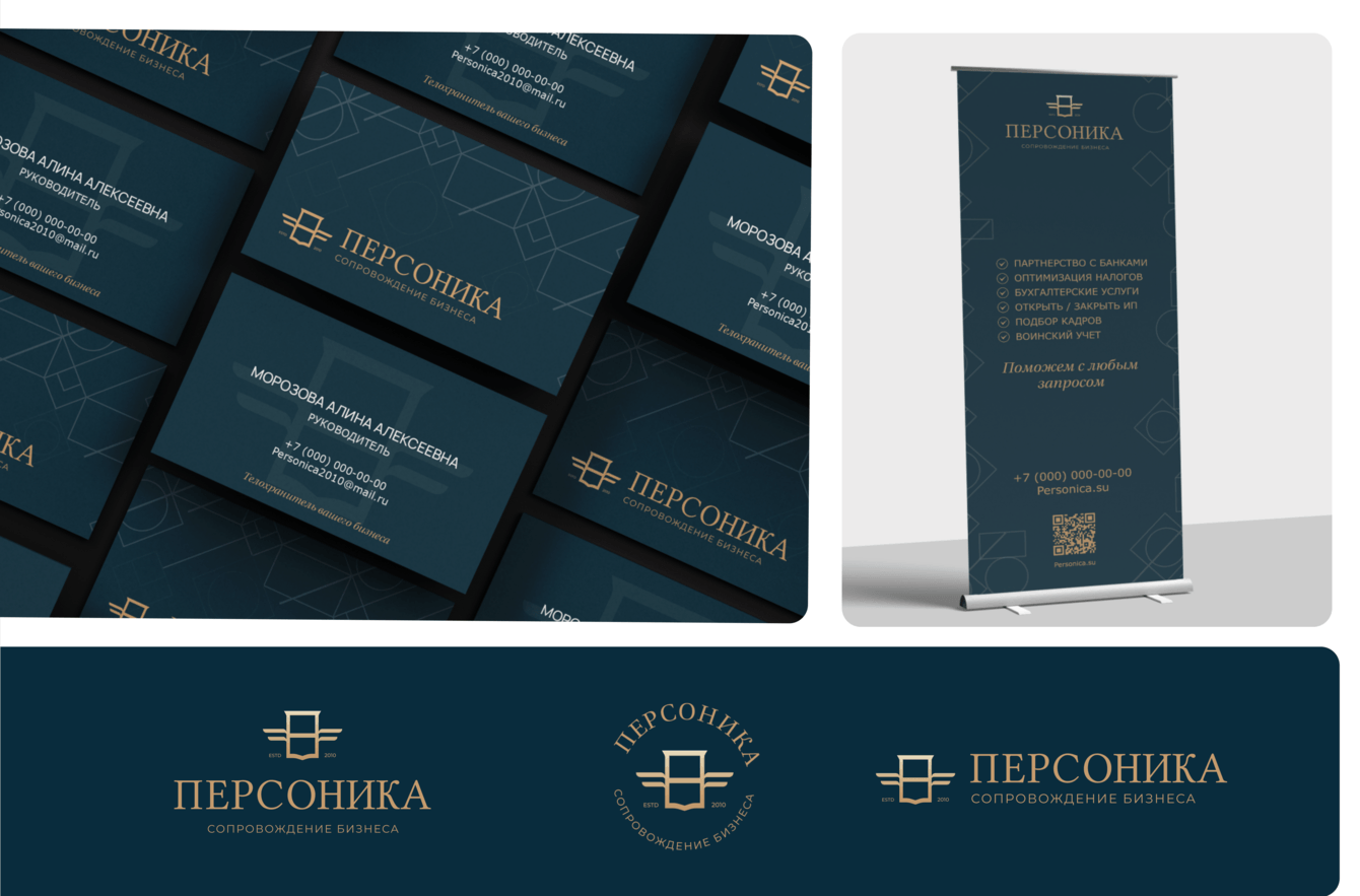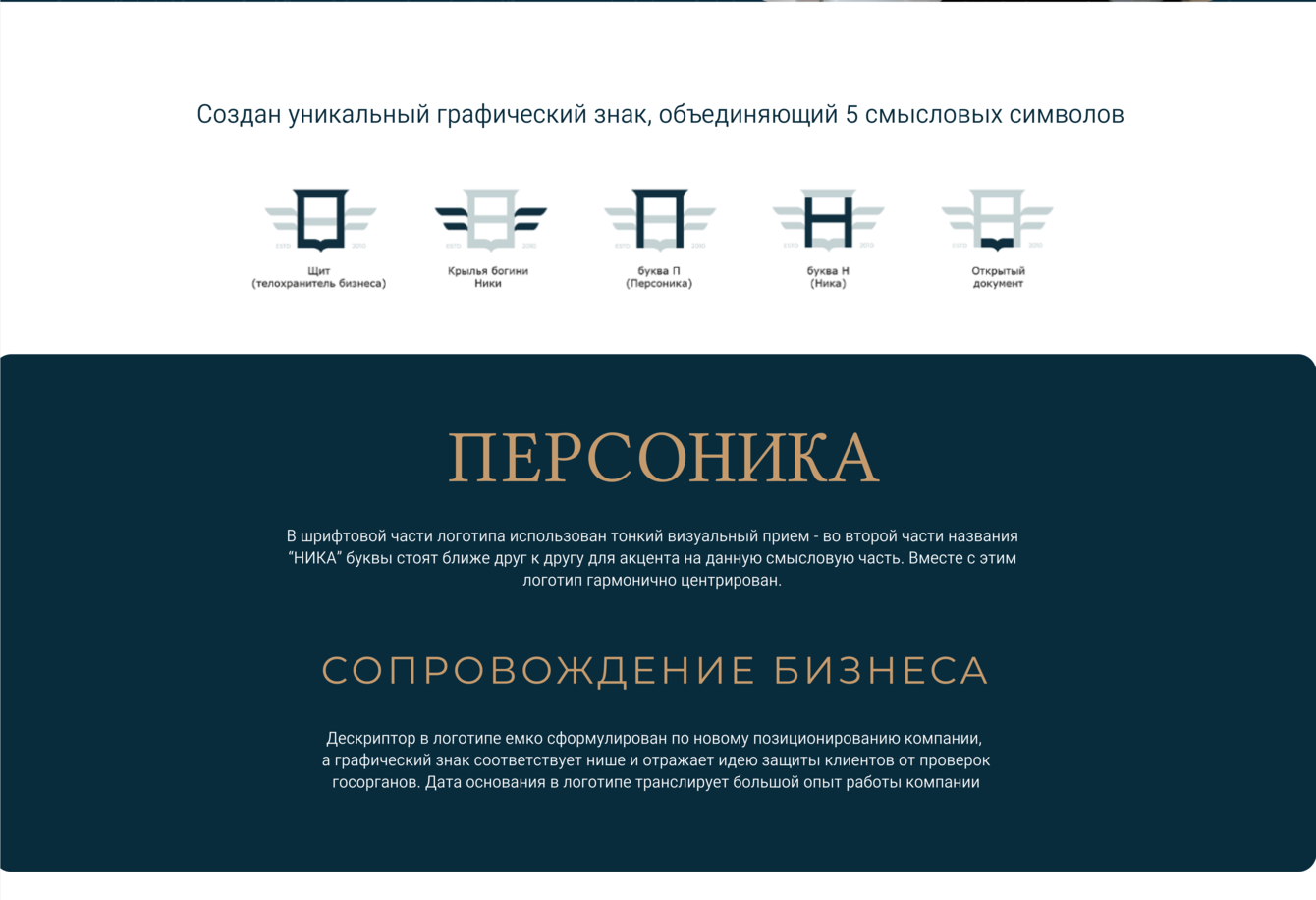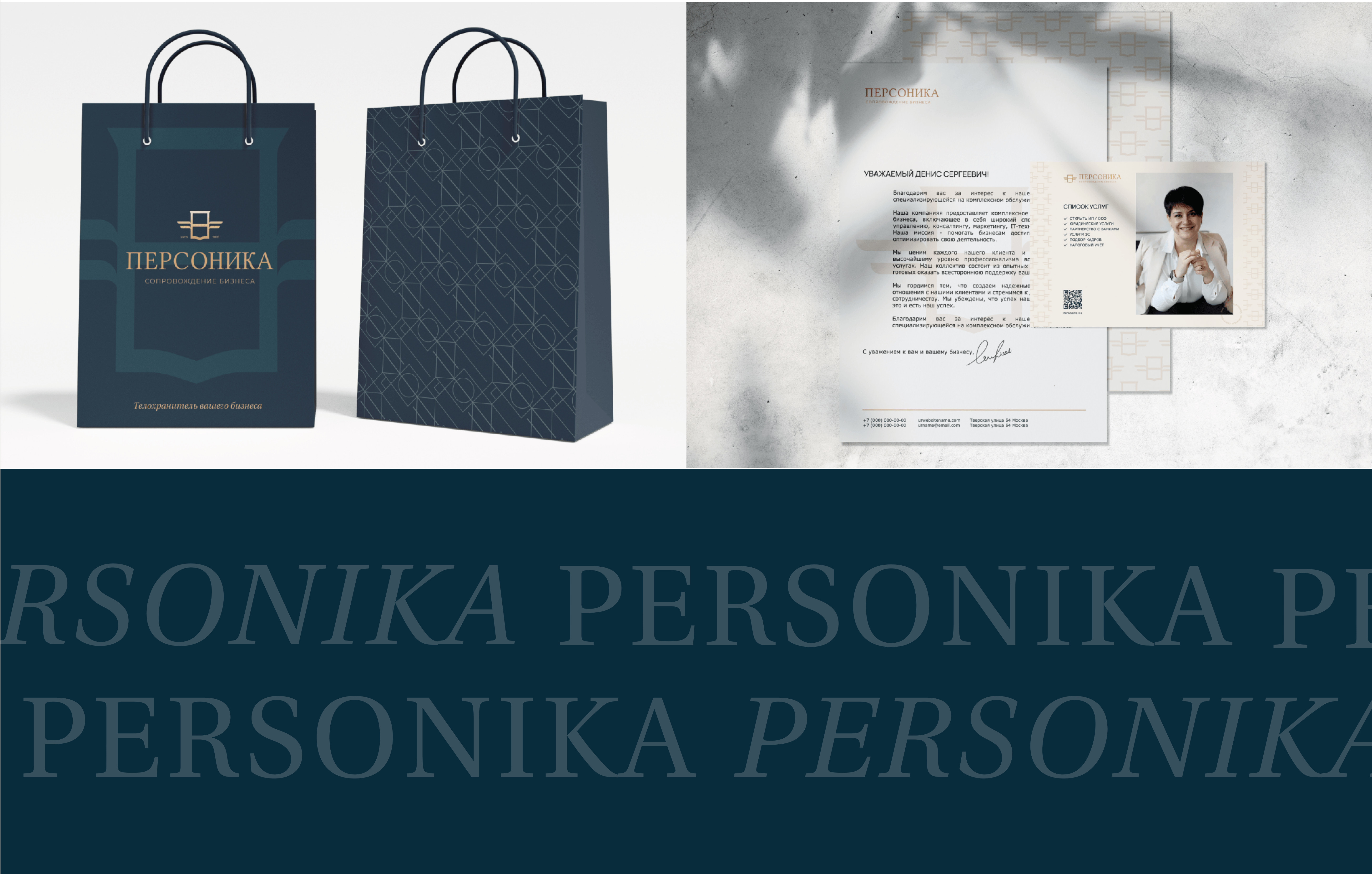 Разработали название «Персоника», объединяющее два смысла: «персона» (личность, индивидуальный подход) и «Ника» (богиня победы). Это отражает суть компании — победа над сложностями в правовых и налоговых вопросах благодаря сильной команде и вниманию к каждому клиенту. Утвердили дескриптор «сопровождение бизнеса», который ёмко описывает услуги.
