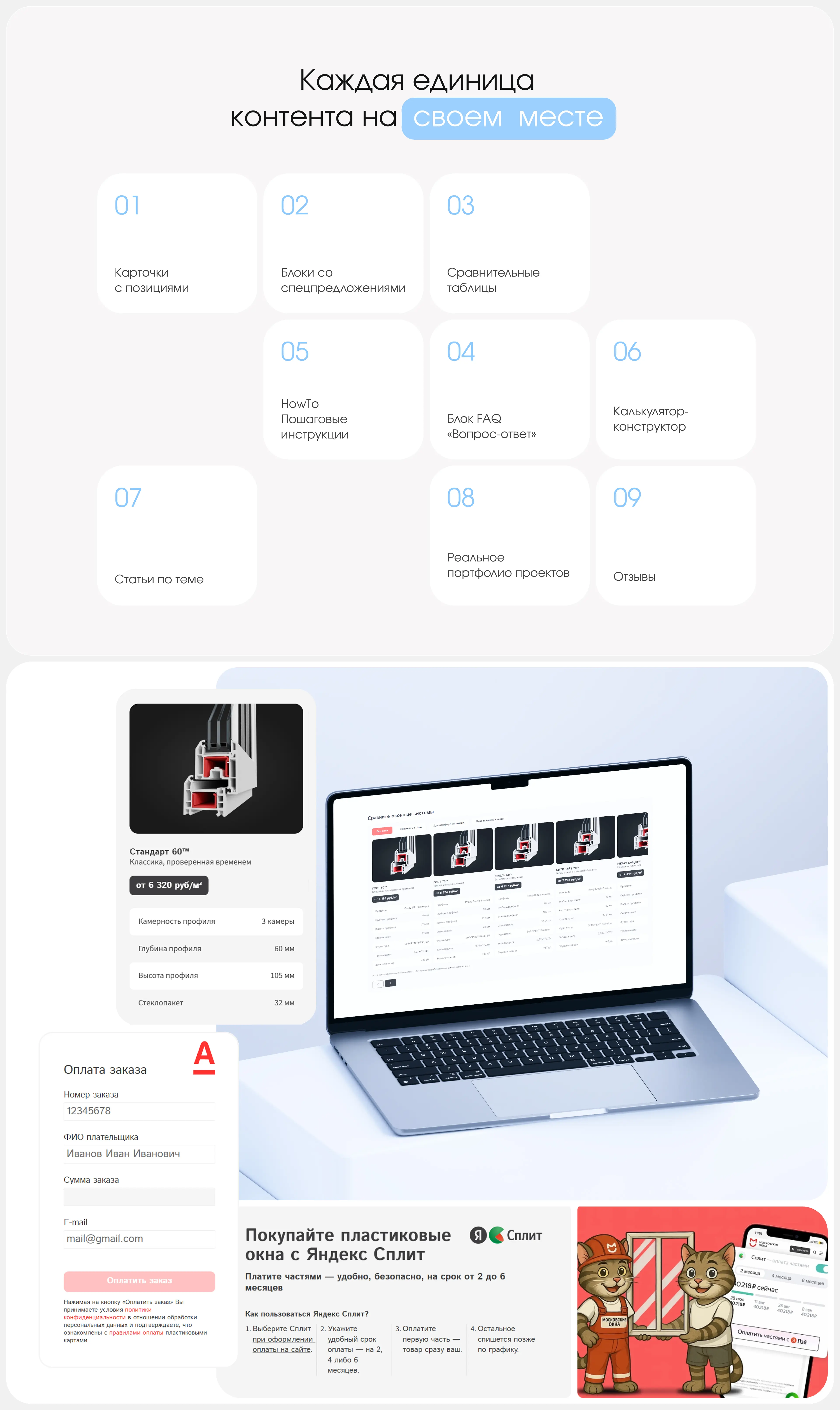 Также мы периодически пересобираем структуру страниц, меняем местами блоки, чтобы улучшить логику подачи информации. Особое внимание уделяем главной странице, которая должна содержать самую ключевую информацию и четкий призыв к действию.