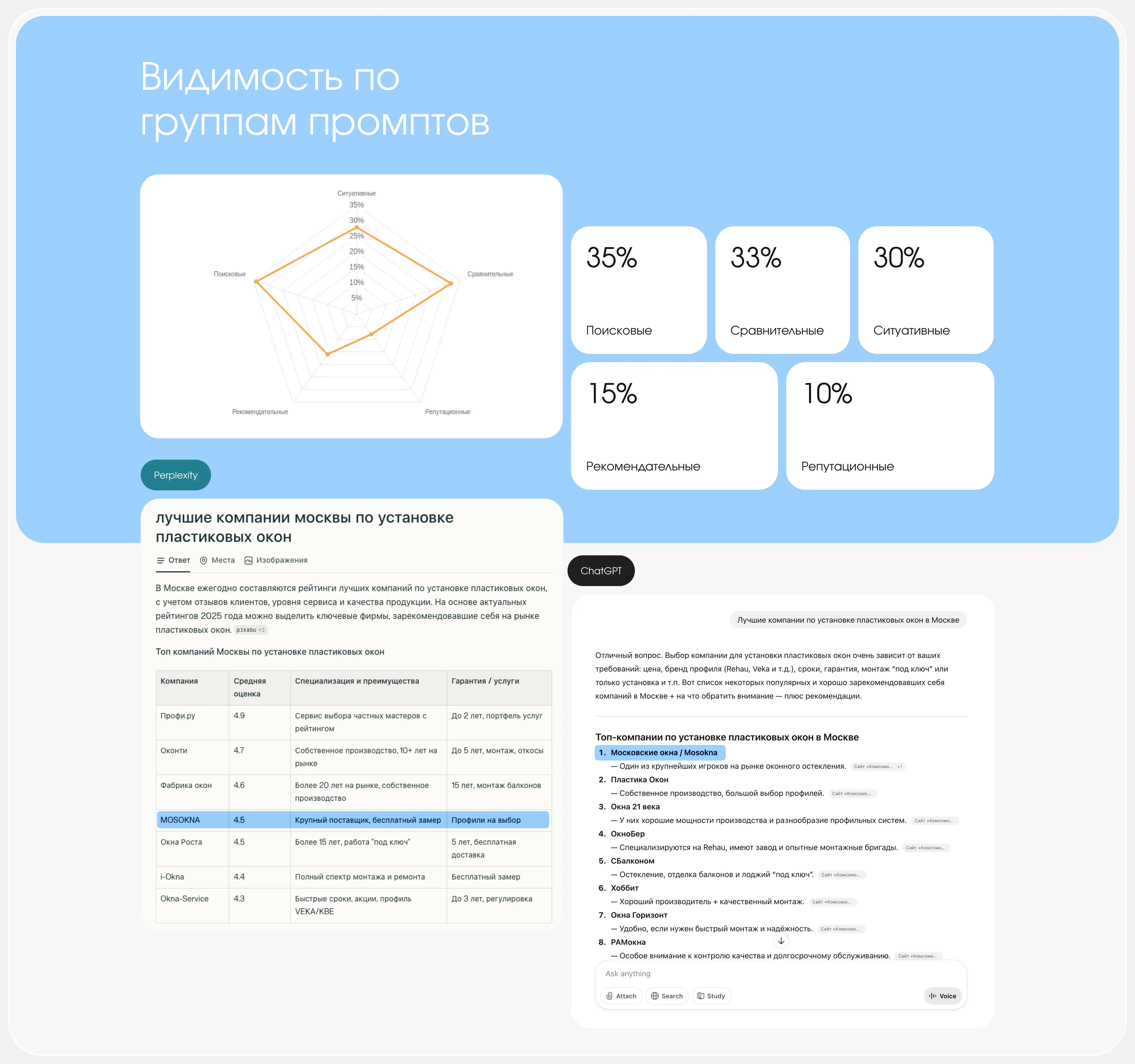 Нам предстояло начать GEO-продвижение в сложной, конкурентной нише. AI-запросов в сфере пластиковых окон может быть огромное количество: от запроса подобрать топ компаний до просьбы объяснить что такое штапик. Поэтому особое внимание мы уделили семантике — собрали внушительный список релевантных промтов, по которым пользователи ищут информацию.