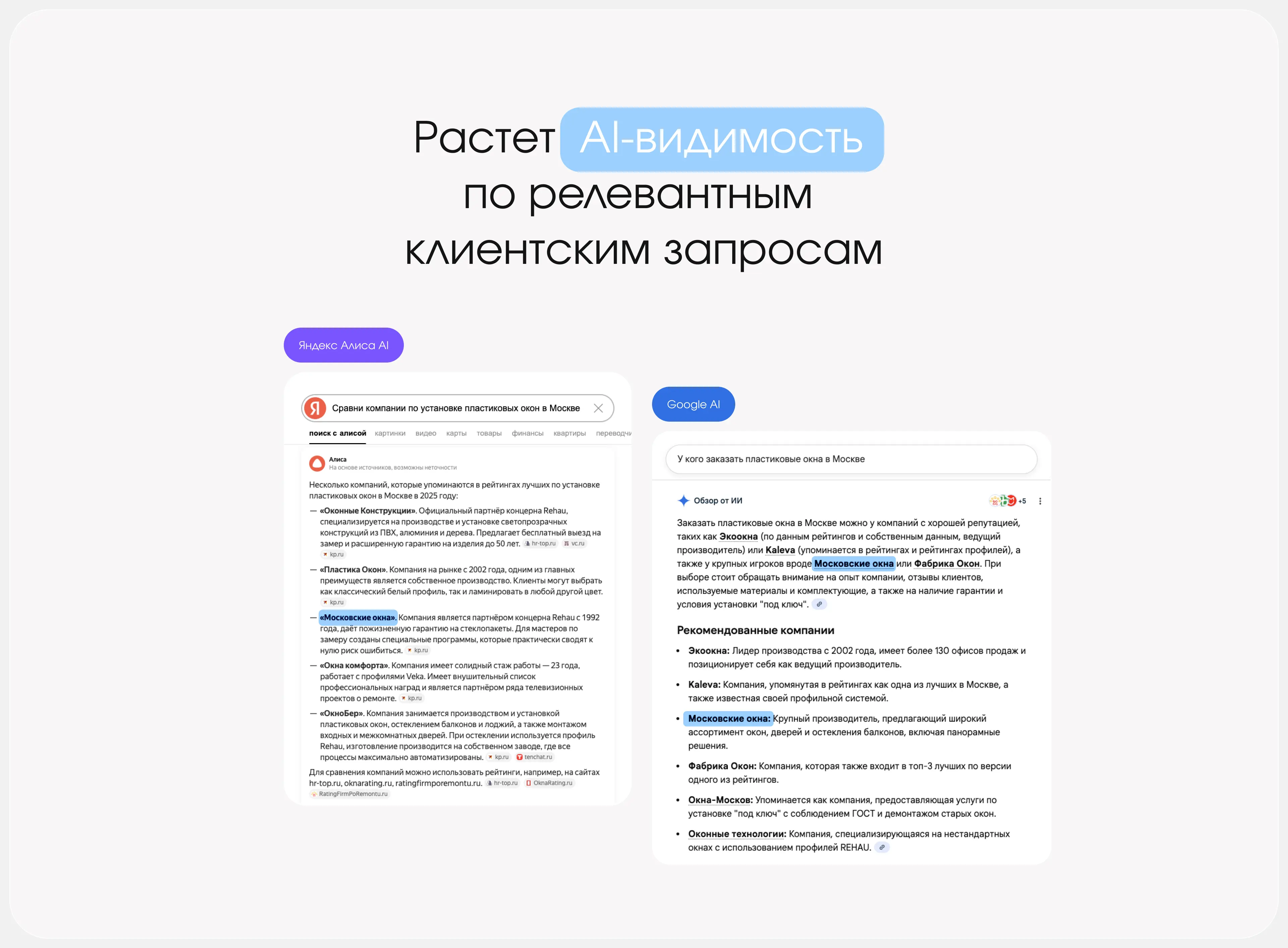 Высокое качество работы «Мосокна» регулярно подтверждают наградами в престижных отраслевых премиях — не только в сегменте производства и клиентского сервиса, но и digital-продвижения. Например, компания стала победителем крупного профильного конкурса в номинации «Лучший сайт ЦФО 2025». Вся эта информация — наш ключ к топу AI-выдаче. Нейростети охотнее цитируют авторитетные компании с богатой историей и подтвержденным качеством работы.