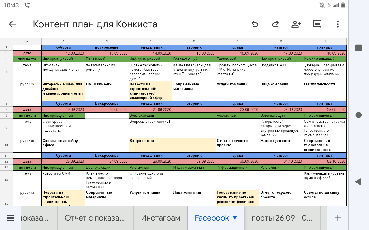 Для последующего анализа контента и возможности корректировать стратегию продвижения в социальных сетях была внедрена таблица анализа с ежедневными показателями вовлеченности аудитории и совершения целевых действий. При этом итоговые коэффициенты рассчитываются автоматически, остаётся только проанализировать какой контент вызывает большую реакцию, а какой хорошо генерит заявки.