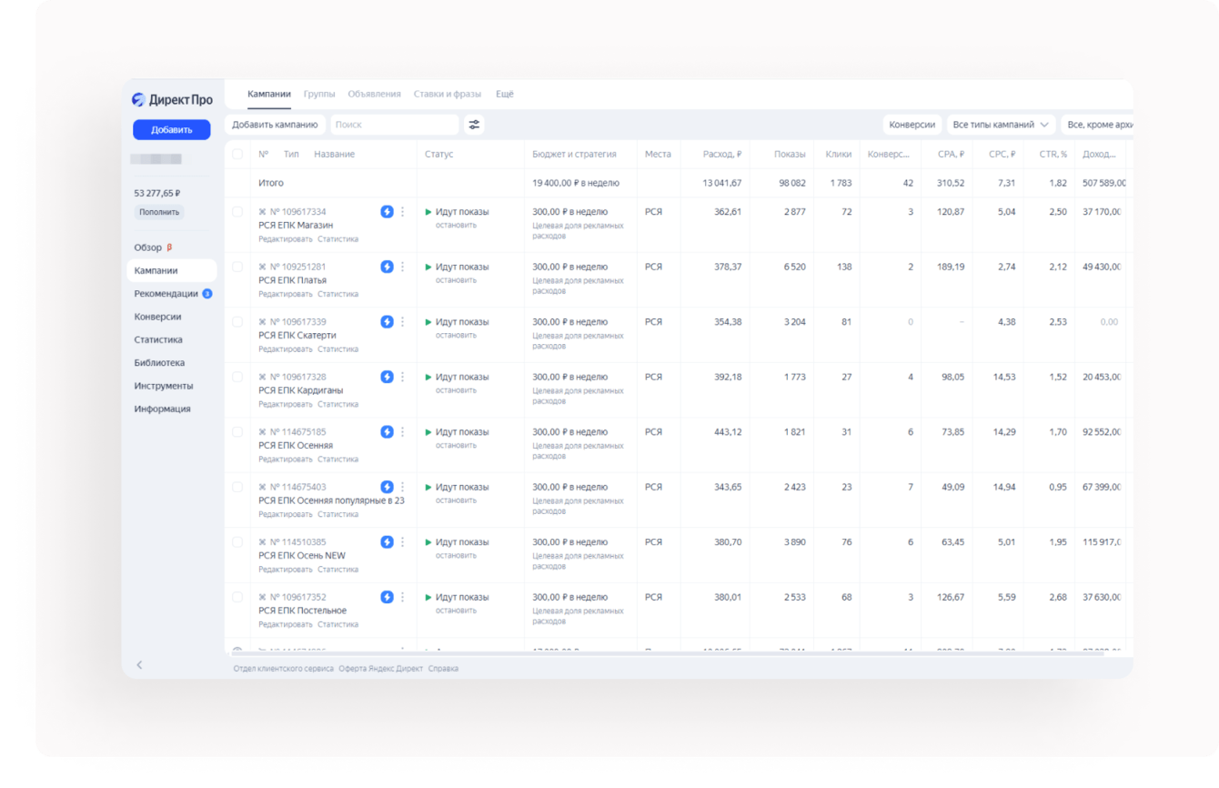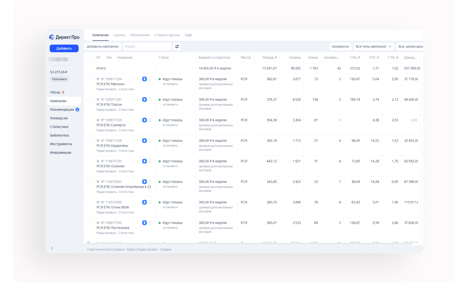 На данный момент провели перераспределение бюджетов на сезонные товары осень-зима, также очень хорошо показала себя Товарная кампания с оплатой за конверсии, которой на данный момент выделена основная часть бюджета.