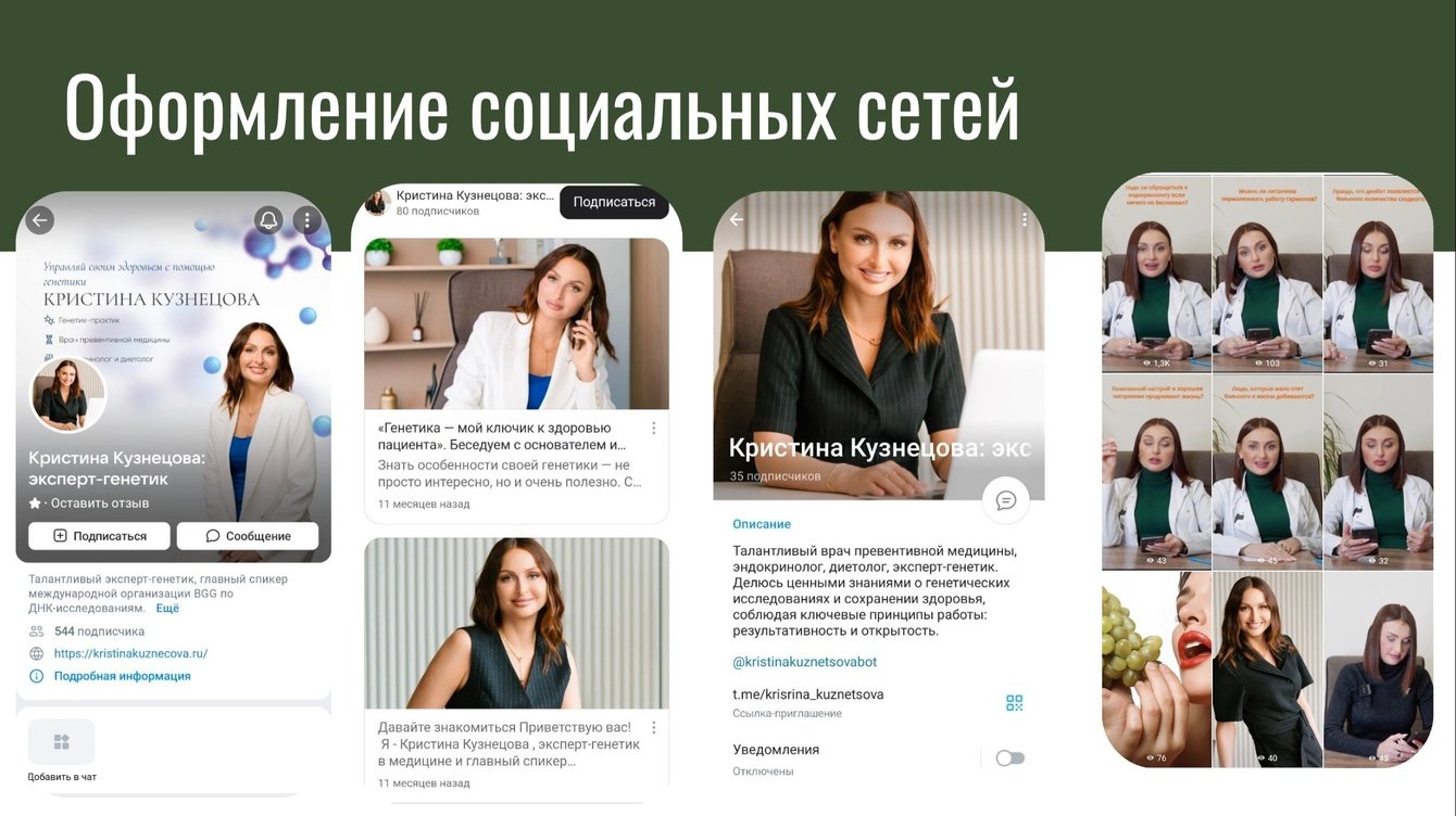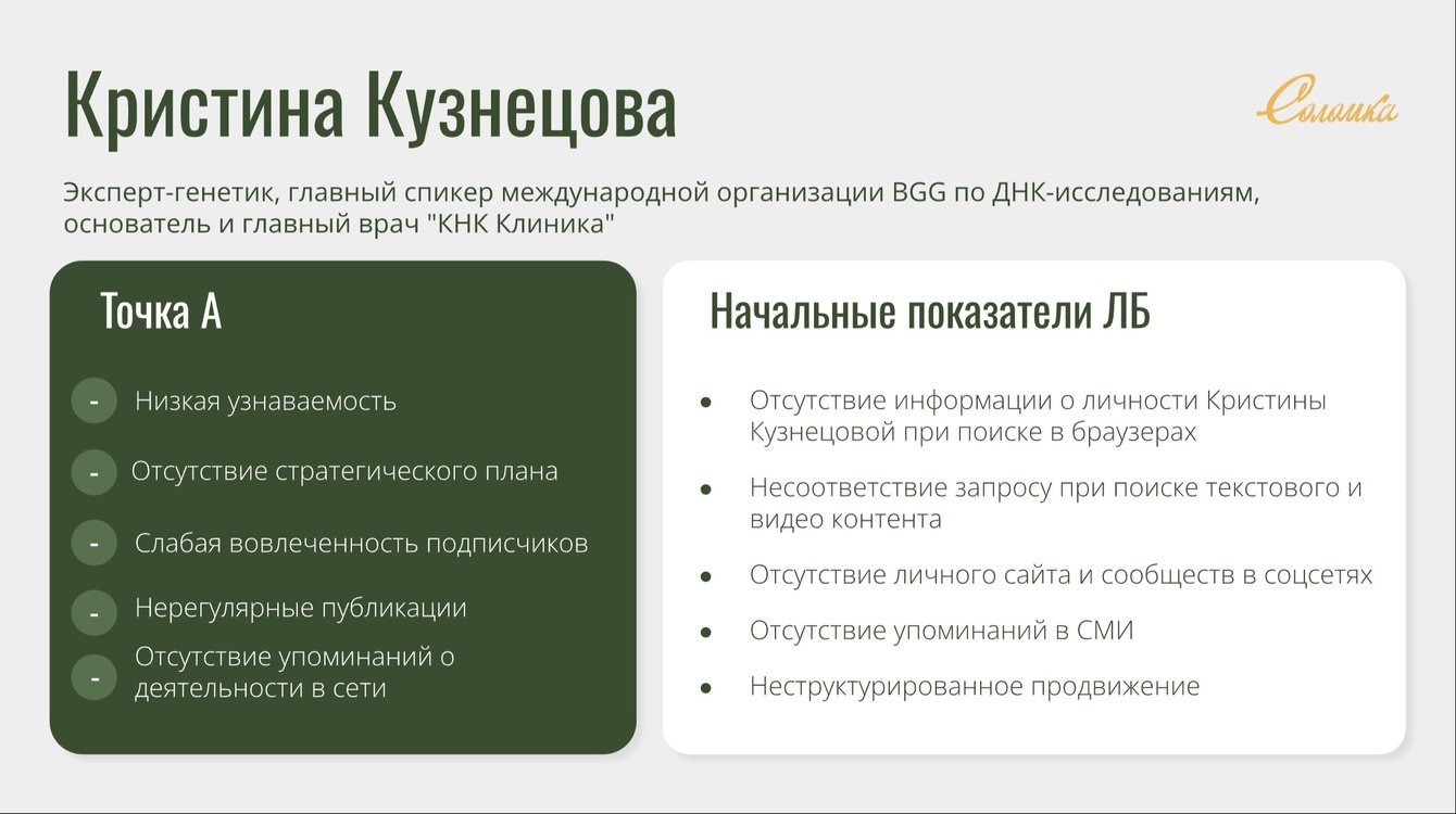 Кристина Кузнецова, ученый-генетик с серьезным академическим бэкграундом и практическим опытом в медико-генетической диагностике, обратилась с запросом на развитие личного бренда. Несмотря на глубокую экспертизу, ее цифровое присутствие не отражало реальный уровень компетенций и не позволяло масштабировать просветительскую и консультационную деятельность.