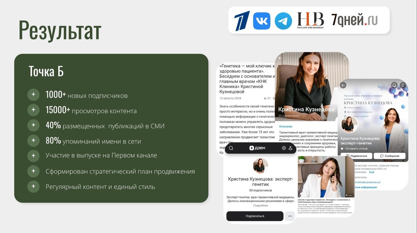 Задачей стало развитие личного бренда Кристины Кузнецовой как авторитетного и доступного эксперта в области генетики. Сформировать устойчивую цифровую экосистему для просвещения аудитории, привлечения клиентов в консультационную практику и укрепления статуса в профессиональной среде.
