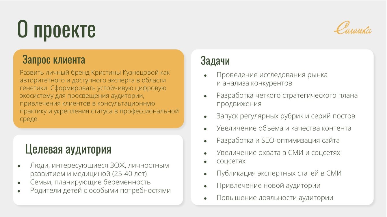 Работать с «Соломкой» — это как найти коллег, которые говорят с тобой на одном языке. Они умеют слушать, слышать, а потом превращать это в стратегию — без суеты, но с тёплой поддержкой на каждом этапе. Как в медицине: за кажущейся простотой решений стоит большой труд и ответственность. Очень рада, что нашла таких партнёров!