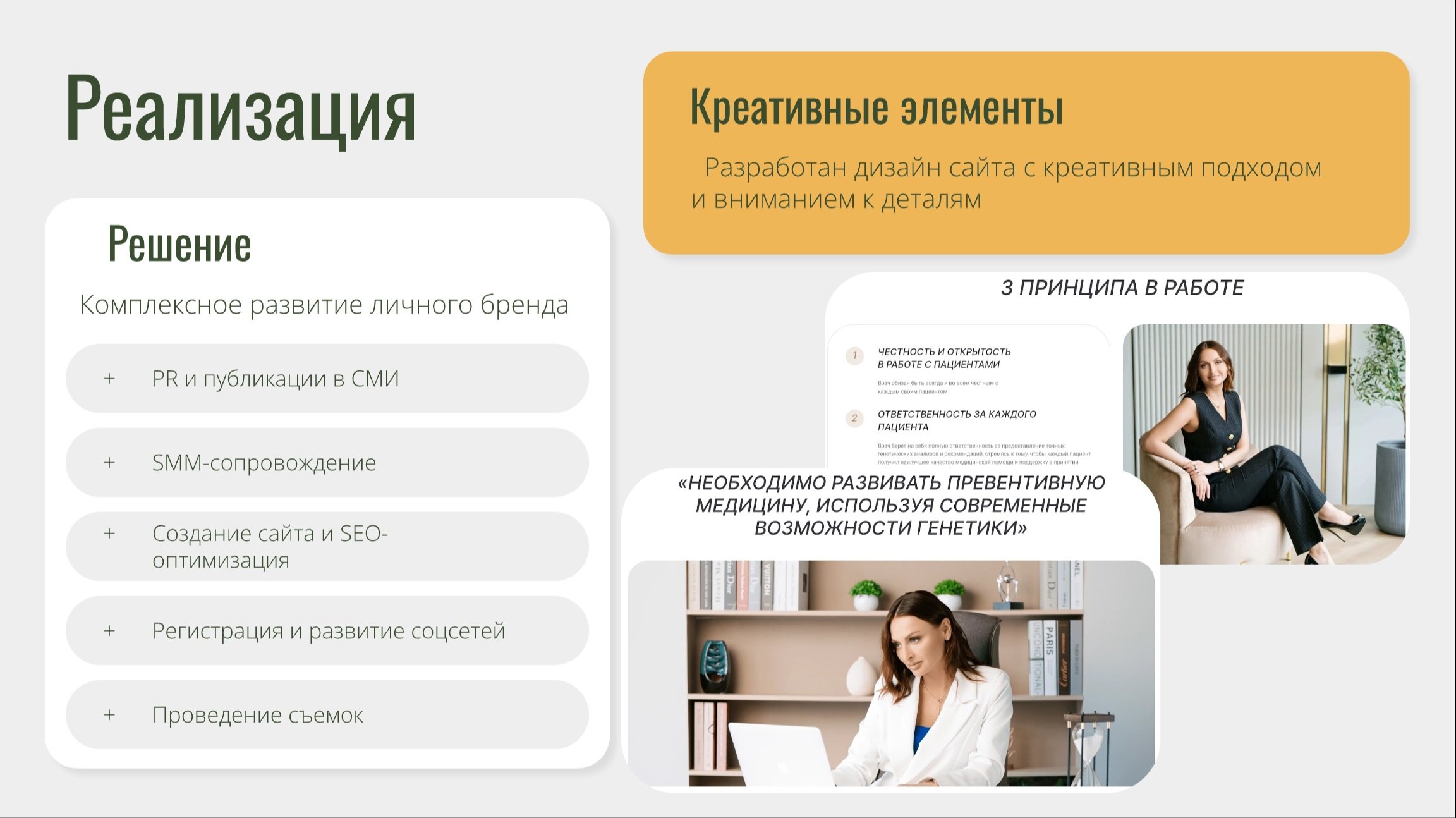 Задачей стало развитие личного бренда Кристины Кузнецовой как авторитетного и доступного эксперта в области генетики. Сформировать устойчивую цифровую экосистему для просвещения аудитории, привлечения клиентов в консультационную практику и укрепления статуса в профессиональной среде.