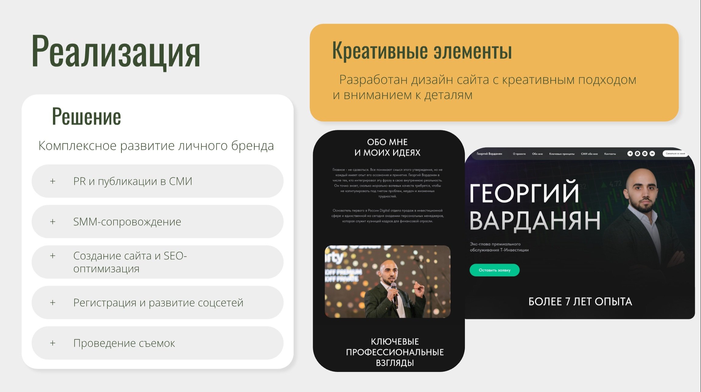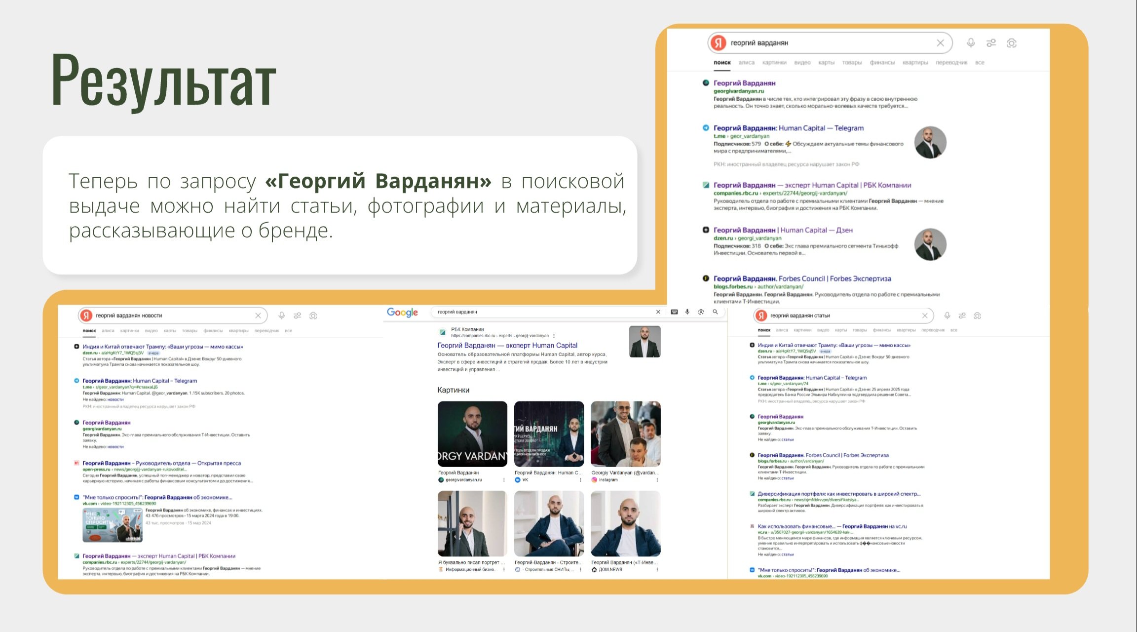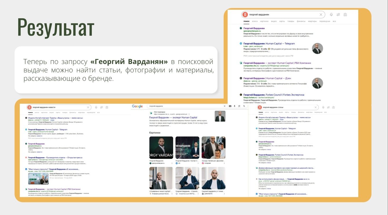 Разработан и запущен персональный сайт с SEO-оптимизацией, социальные сети оформлены в едином стиле с учетом поисковых запросов, связанных с именем Георгия Варданяна. Достигнуто устойчивое присутствие в поисковой выдаче по ключевым тематическим запросам.