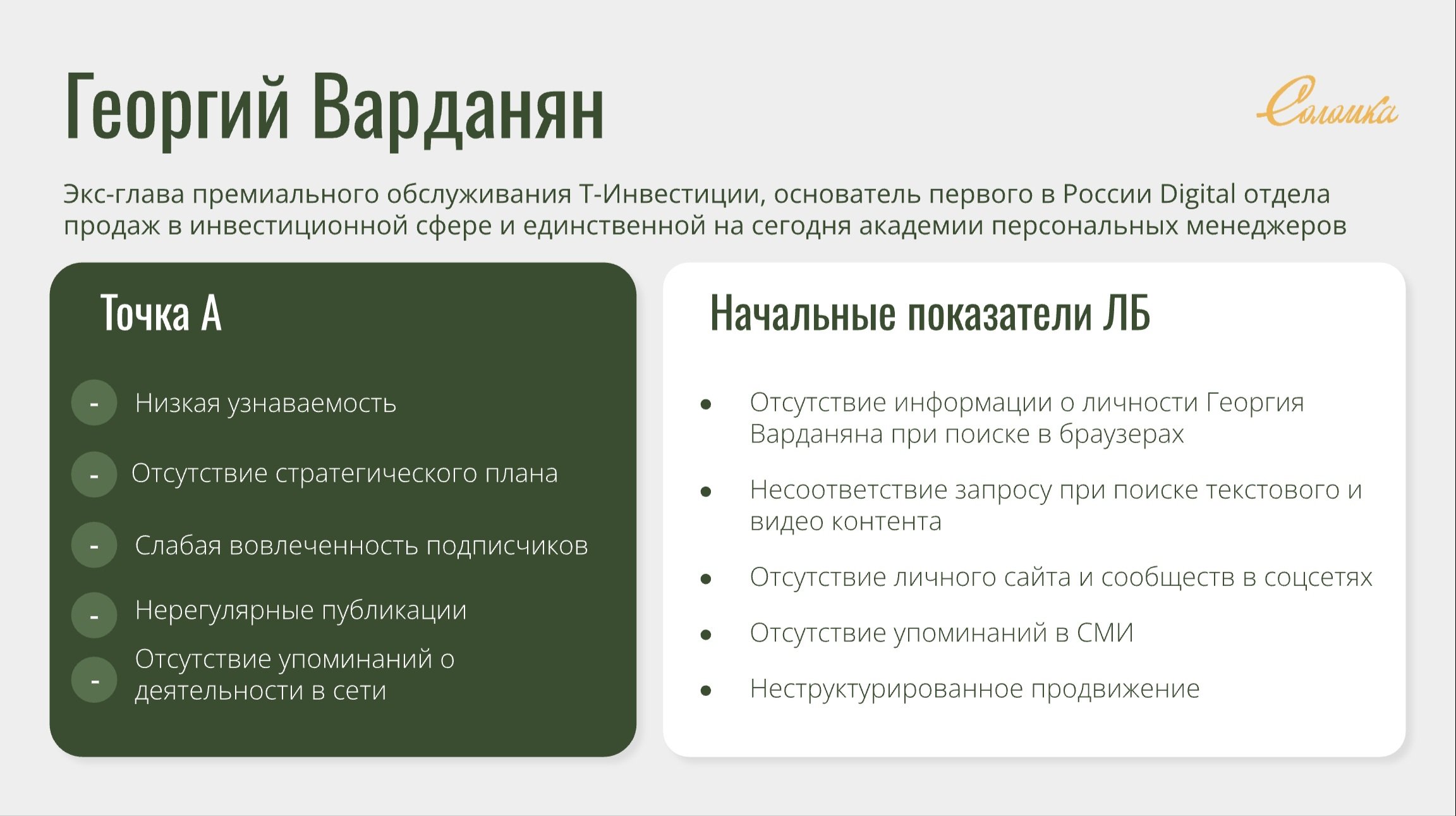 Проведены глубинные интервью, выявлены личные ценности и экспертный профиль. Выполнен аудит текущего цифрового присутствия и позиционирования, а также анализ конкурентов в сфере инвестиций и стратегий продаж. Разработана детальная стратегия развития личного бренда Георгия с учетом целевой аудитории: топ-менеджеры, руководители высшего и среднего звена, бизнесмены среднего и крупного бизнеса