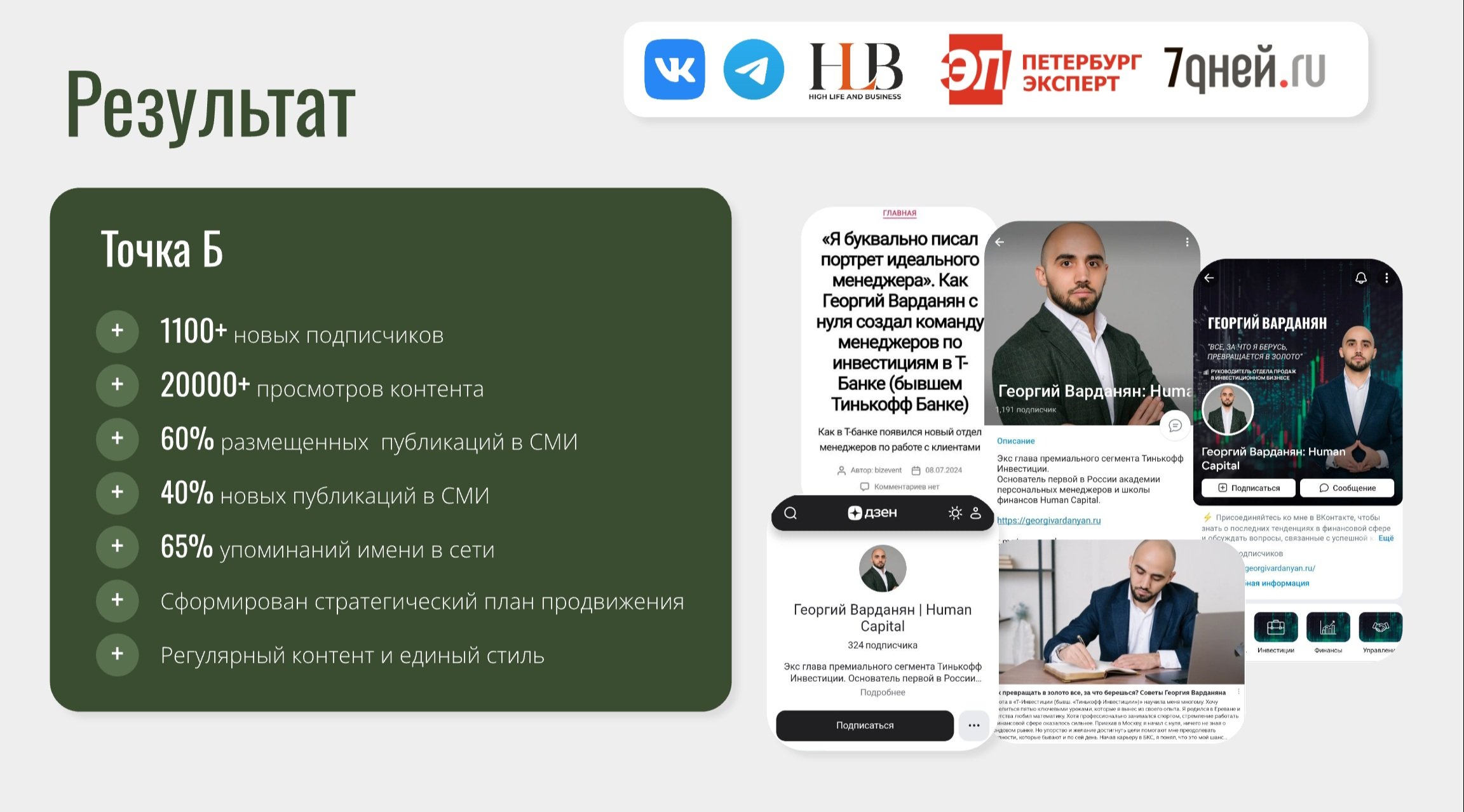 Используя экспертные знания и опыт, развить личный бренд Георгия Варданяна в связке с брендом платформы Human Capital, с целью привлечения бизнес-аудитории, укрепления экспертного статуса и масштабирования присутствия в медиа и соцсетях