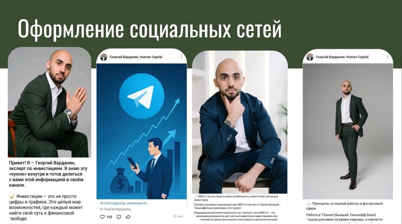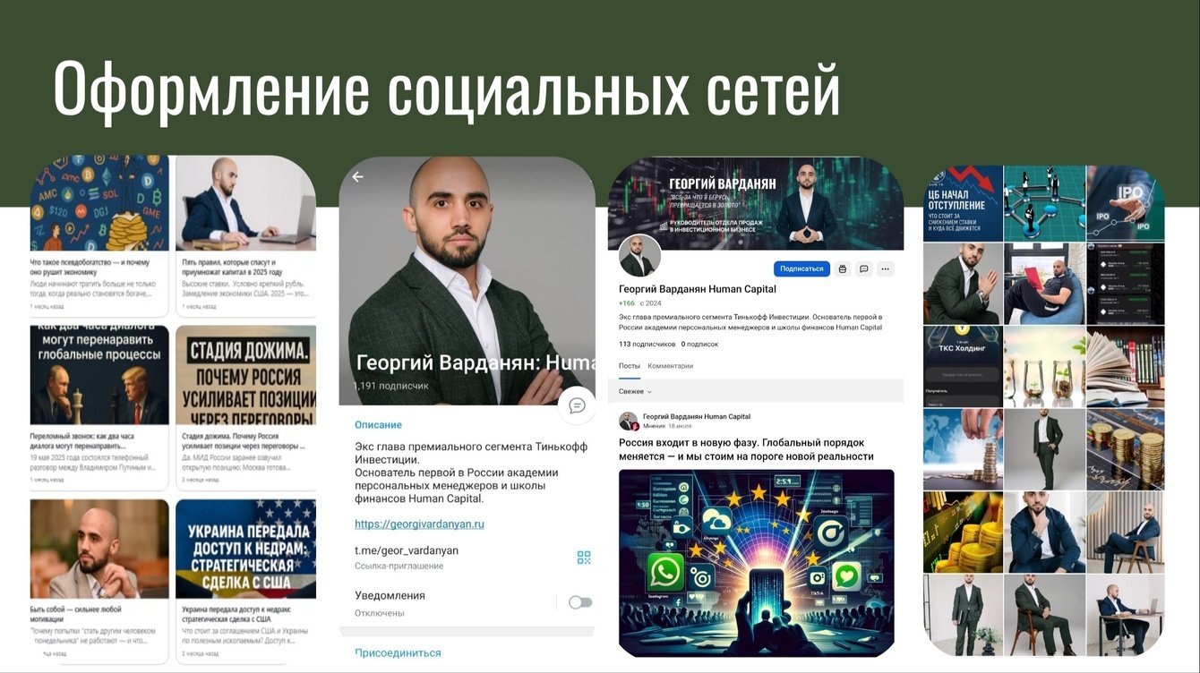 Обеспечивается регулярный анализ эффективности: мониторинг охвата, вовлеченности, публикаций и контент-стратегии с последующей корректировкой действий. Постоянная поддержка Георгия Варданяна в онлайн- и офлайн-активностях.