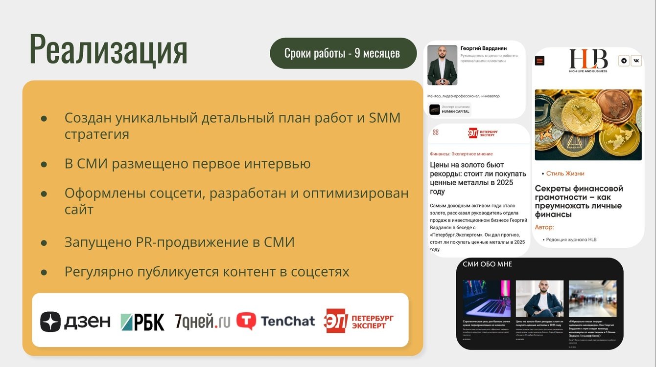Подготовлены авторские статьи и интервью, размещенные в ведущих СМИ и на популярных платформах, включая: РБК, 7дней.ru, Петербург Эксперт, Дзен, VC и др.
