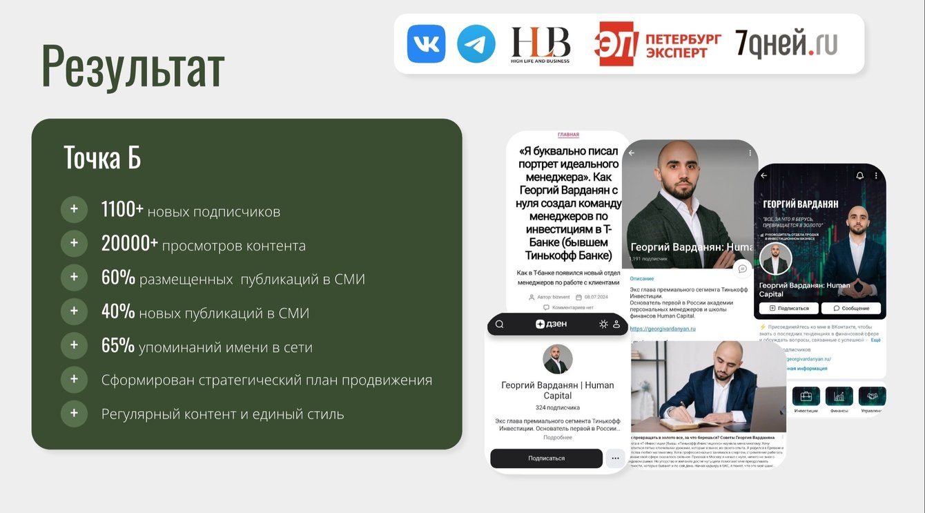 Георгий Варданян обратился с запросом на развитие личного бренда в связке с платформой Human Capital. Несмотря на глубокую экспертизу и активную профессиональную деятельность, его цифровое присутствие требовало системного подхода: отсутствовала четкая стратегия продвижения, контент не был структурирован, а медийная видимость не соответствовала реальному уровню влияния в бизнес-среде. Ключевые задачи включали усиление экспертного позиционирования, привлечение деловой аудитории и масштабирование присутствия в медиа и социальных сетях.