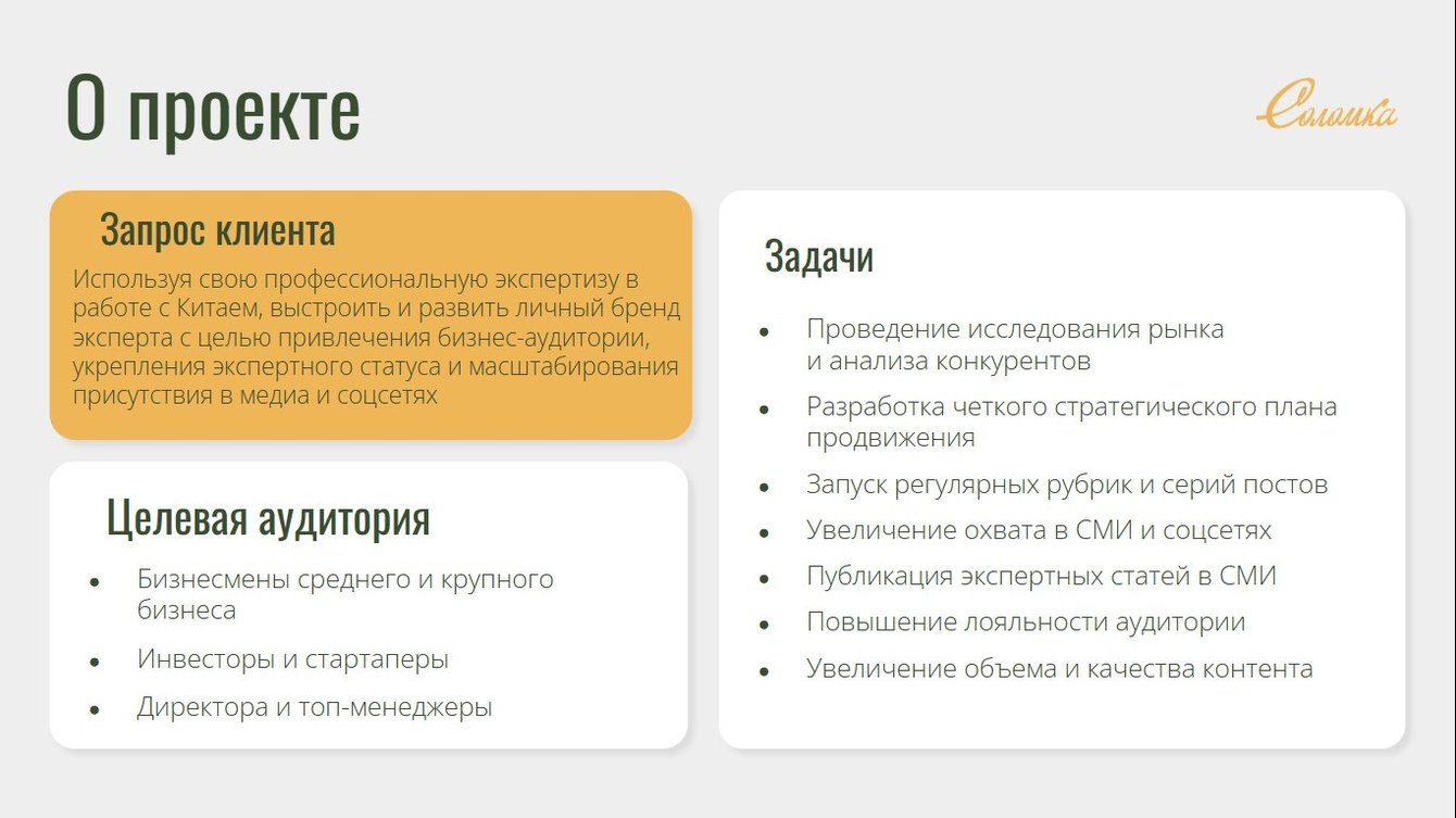 Используя свою профессиональную экспертизу в работе с Китаем, выстроить и развить личный бренд эксперта с целью привлечения бизнес-аудитории, укрепления экспертного статуса и масштабирования присутствия в медиа и соцсетях
