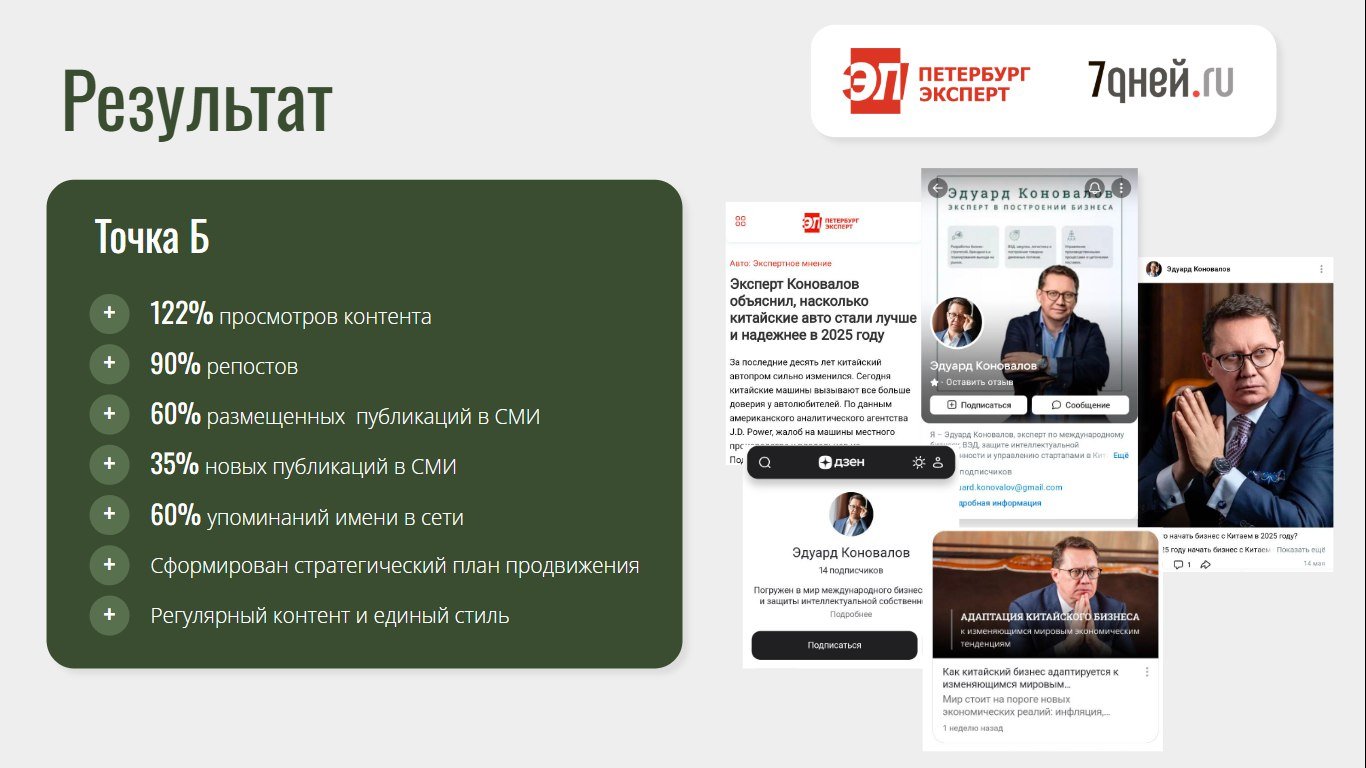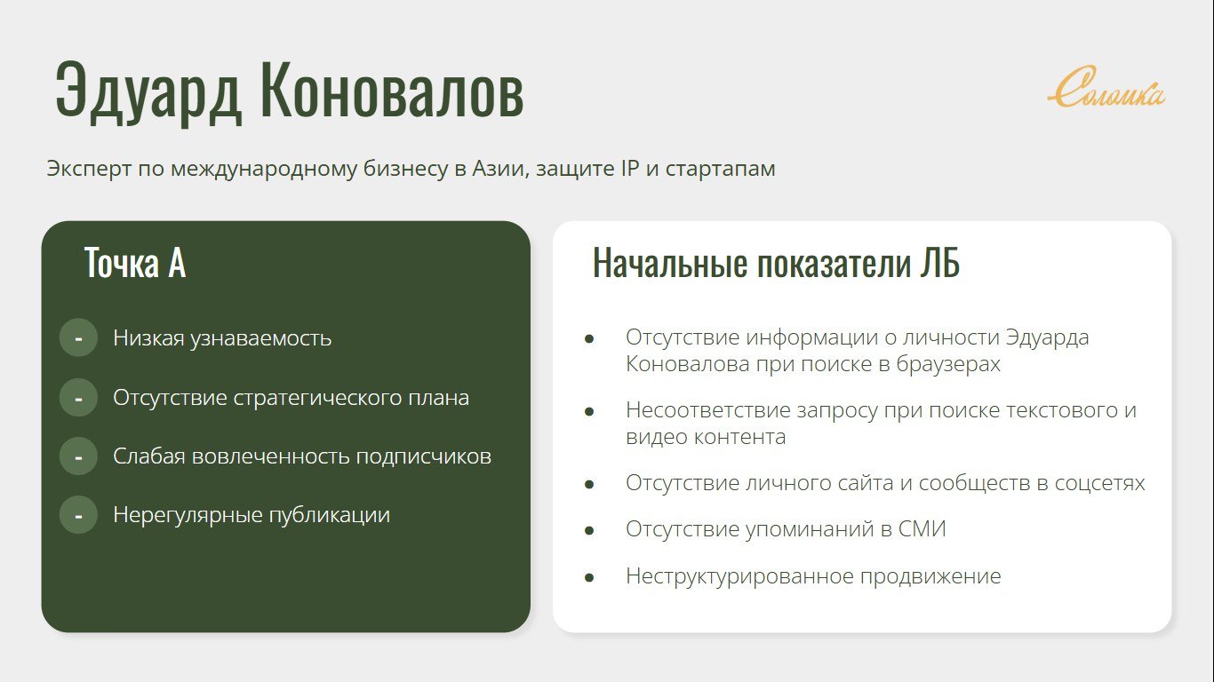 Эдуард обратился с запросом на построение личного бренда эксперта в области международного бизнеса. Несмотря на значительные достижения и высокий уровень экспертности, уровень личной узнаваемости в digital-пространстве был низким, отсутствовала стратегическая коммуникация с целевой аудиторией, не было контента и присутствия в СМИ.