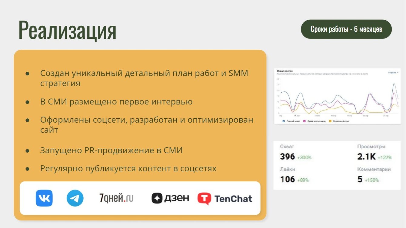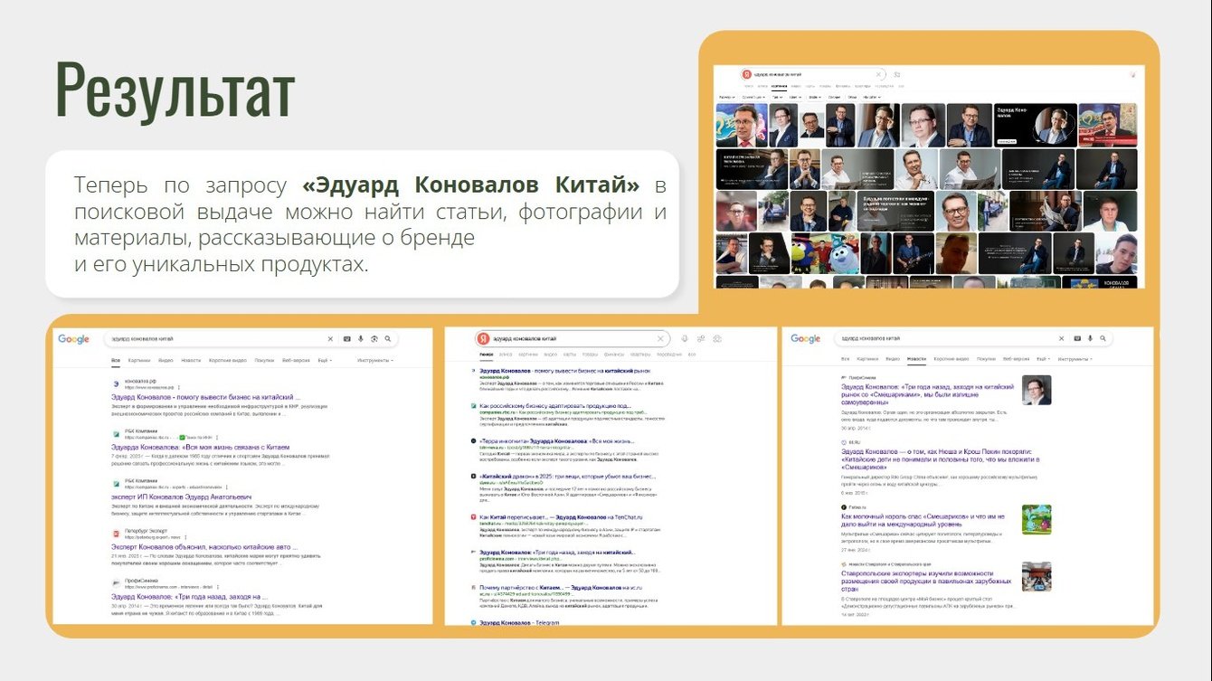 - Повышение узнаваемости и доверия к личности- Рост охвата и вовлеченности в соцсетях- Появление в поисковой выдаче и медиа- Увеличение объема и качества контента