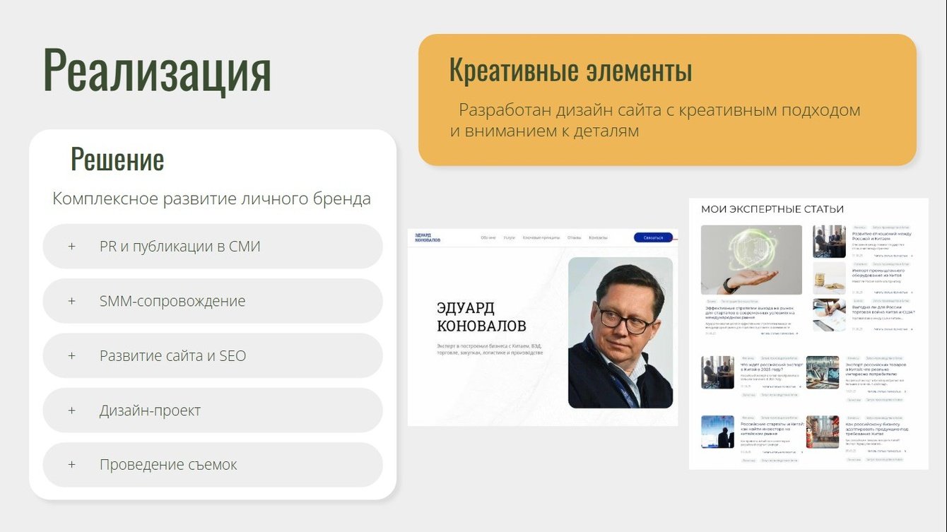 Проведена серия интервью, проработаны личные смыслы и экспертность. Проведен аудит цифрового присутствия и позиционирования, анализ конкурентной среды в сфере международного бизнеса. Сформирован пошаговый стратегический план развития личного бренда Эдуарда с учетом ЦА: бизнесмены среднего и крупного бизнеса, инвесторы и стартаперы, директора и топ-менеджеры.