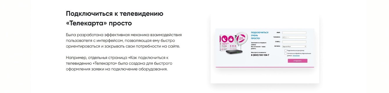 Для эффективной работы сайта «Телекарта» мы оказываем техническую поддержку, развиваем функционал и адаптируем сайт под современные требования.