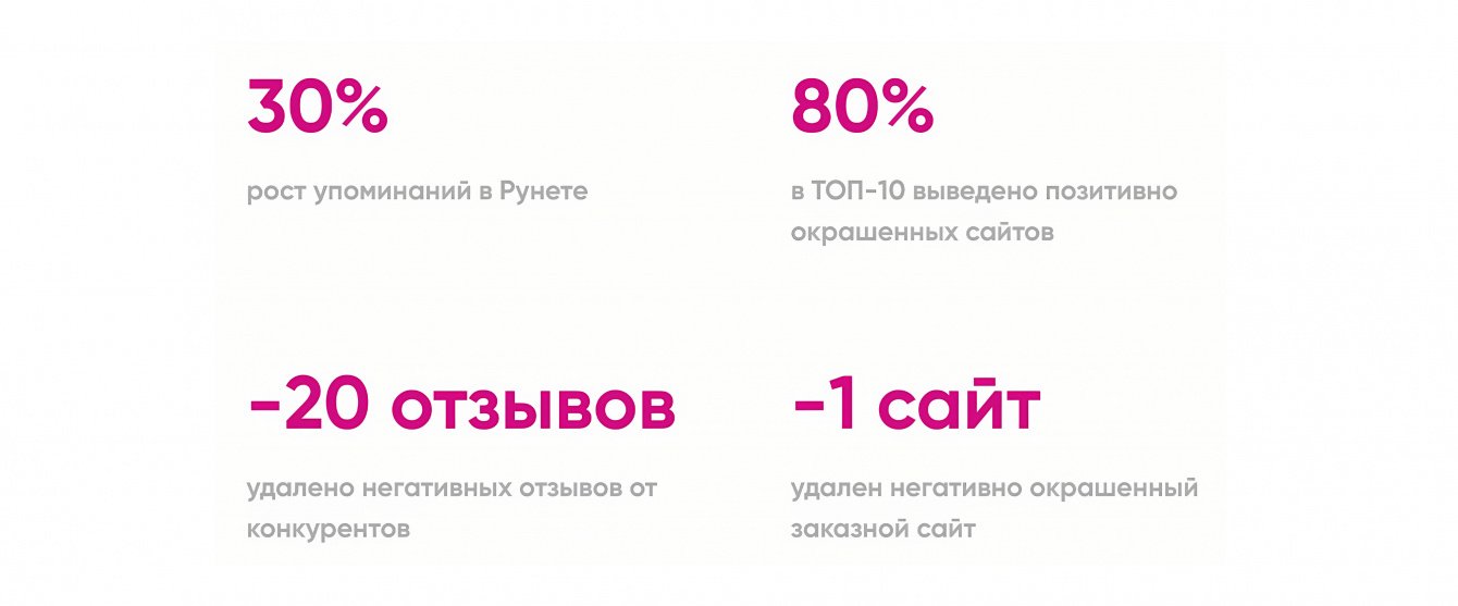 Количество позитивных упоминаний в Рунете увеличилось на 30%. В ТОП-10 выведено 80% позитивно окрашенных сайтов.