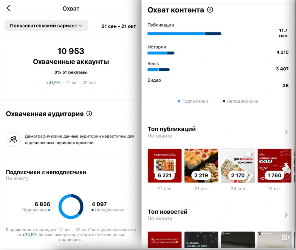 Даже несмотря на блокировку Instagram, аккаунт Sushi Holl продолжается радовать отличными охватами и постоянно прирастающими подписчиками. Останавливаться на достигнутых 15,3К подписчиков мы не собираемся, поэтому активно работаем над улучшением всех показателей профиля.
