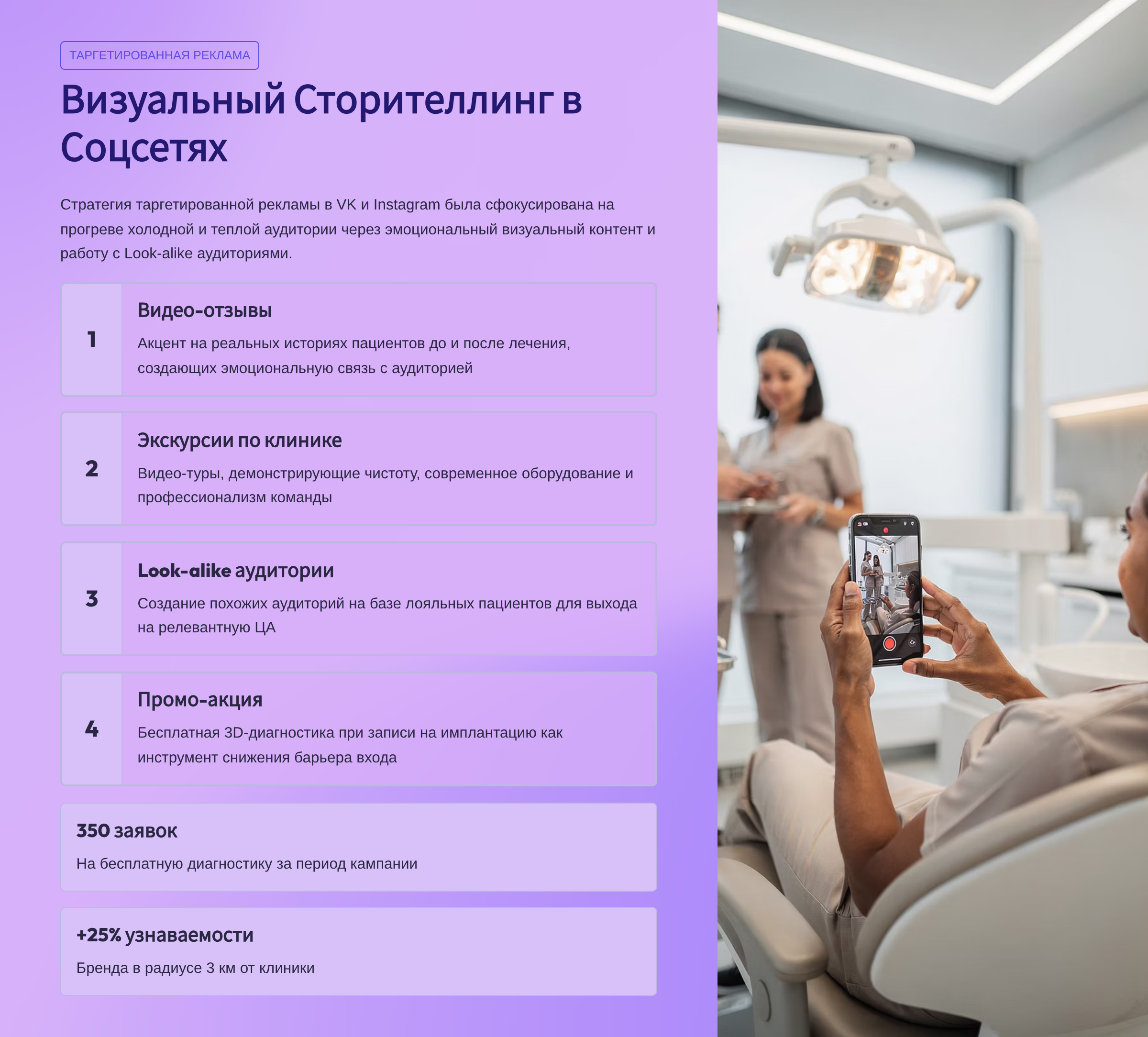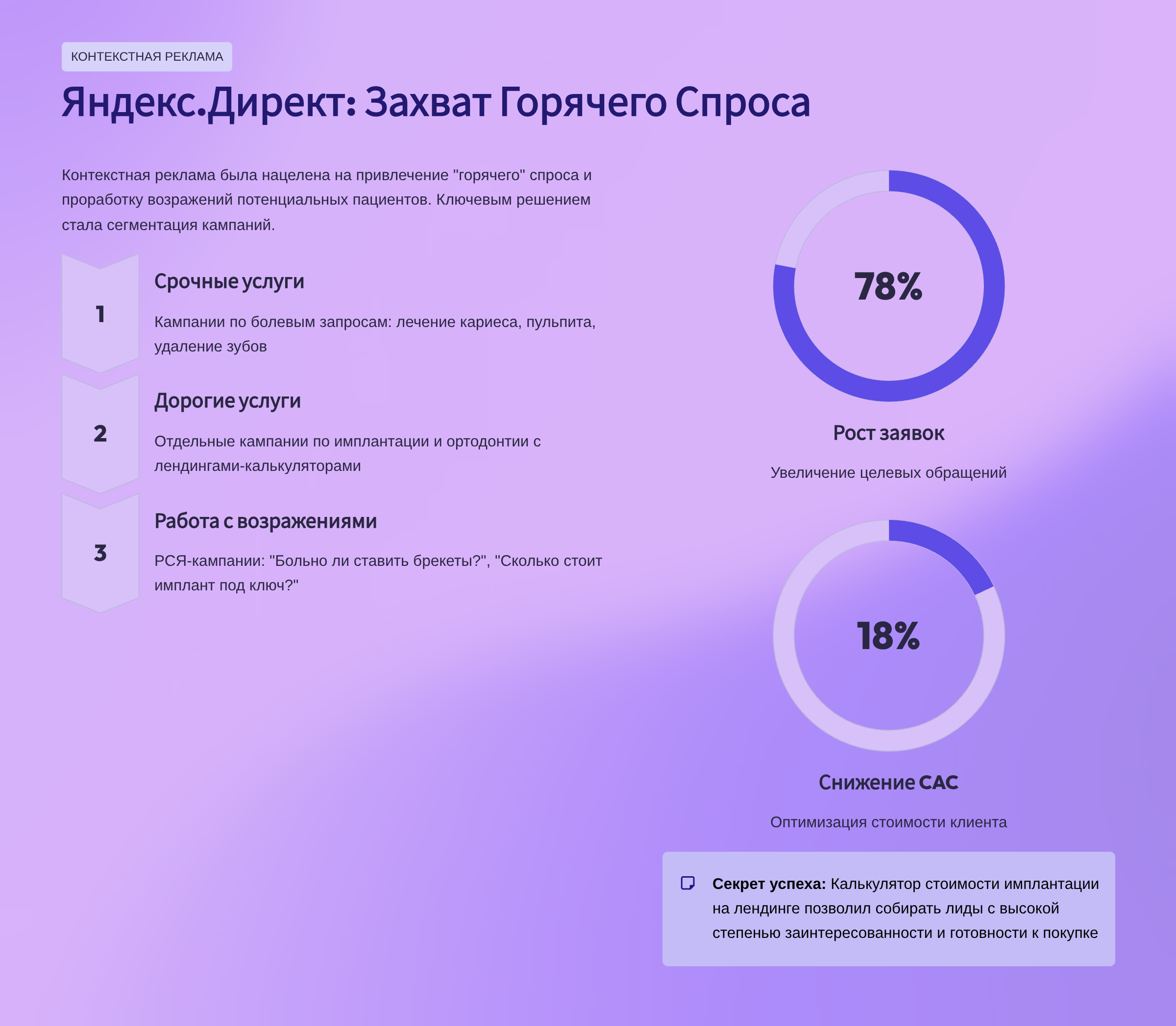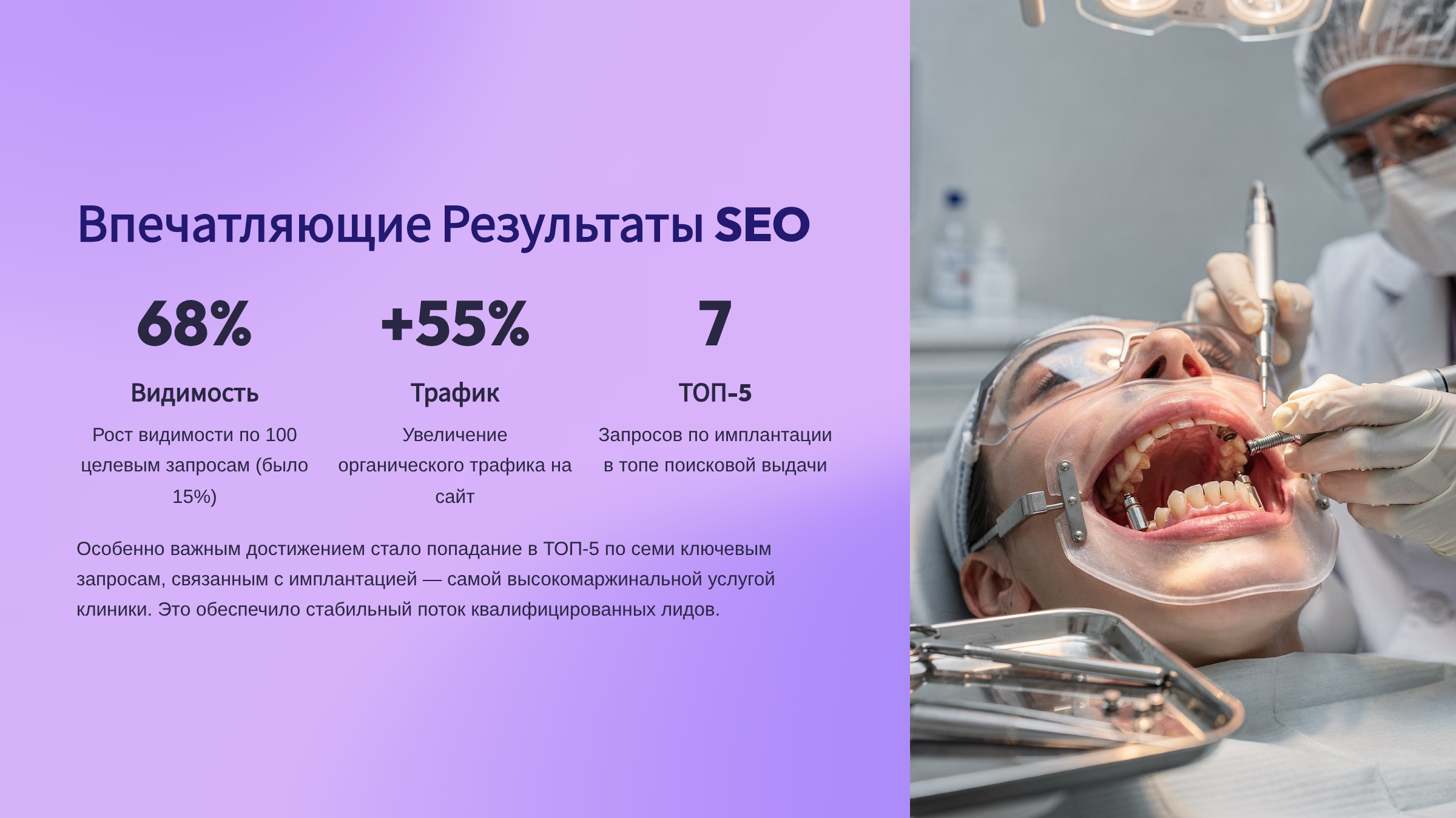 - Увеличить целевые заявки на консультации по имплантации и ортодонтии