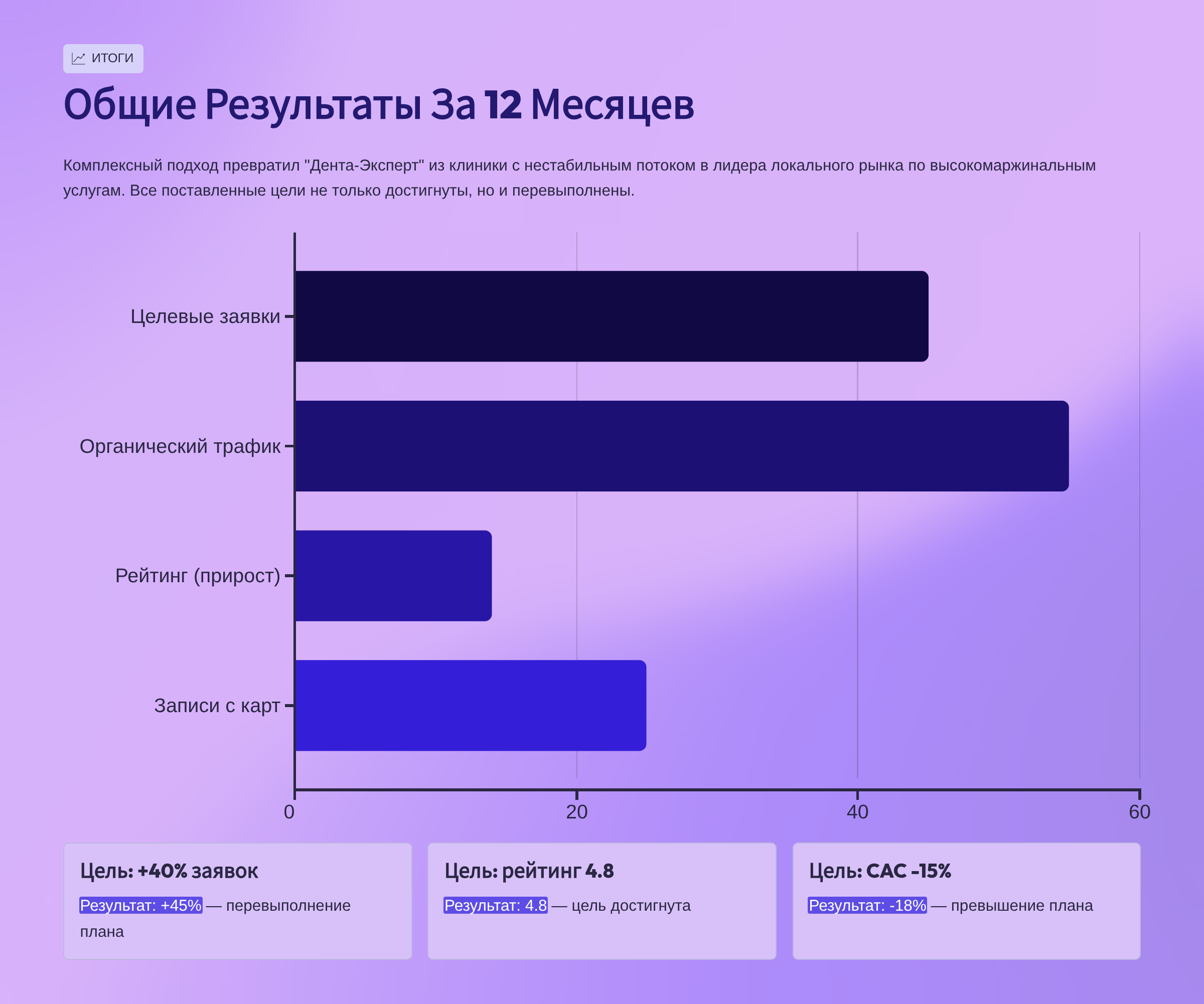 Результат: Клиника стала лидером локального рынка с стабильным потоком пациентов на высокомаржинальные услуги и сильной репутацией, обеспечивающей долгосрочный рост бизнеса