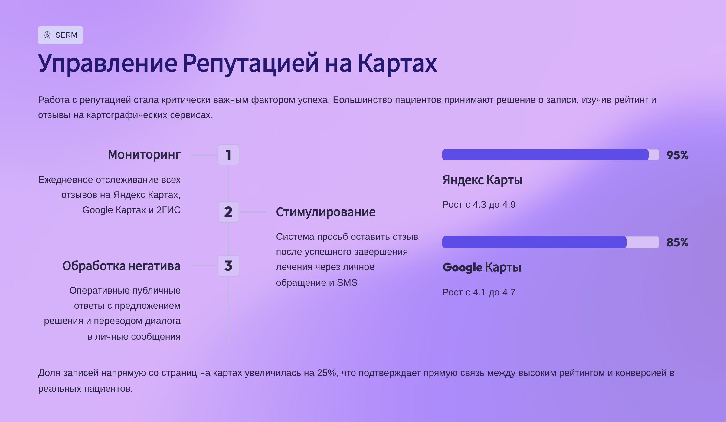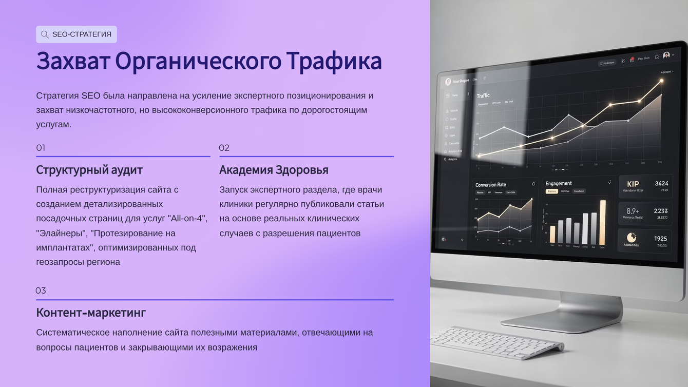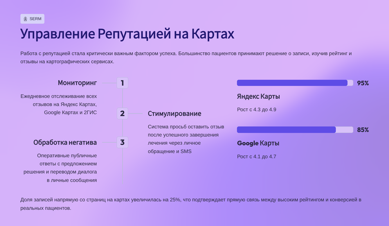 Интеграция SEO, платного трафика и управления репутацией позволила не только привлечь больше пациентов, но и сформировать сильный имидж надежного и высококвалифицированного медицинского центра.