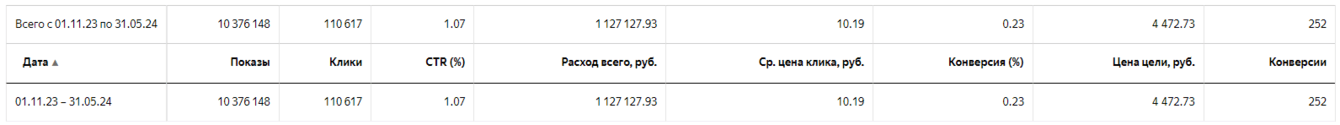 Схема осталась та же: на одну кампанию в РСЯ — один ЖК. По просьбе клиента мы объединили два неприоритетных объекта в одной РК. Бюджеты с ноября по май 2024 г. ощутимо сократились: тратили от 140 000 до 180 000 рублей.