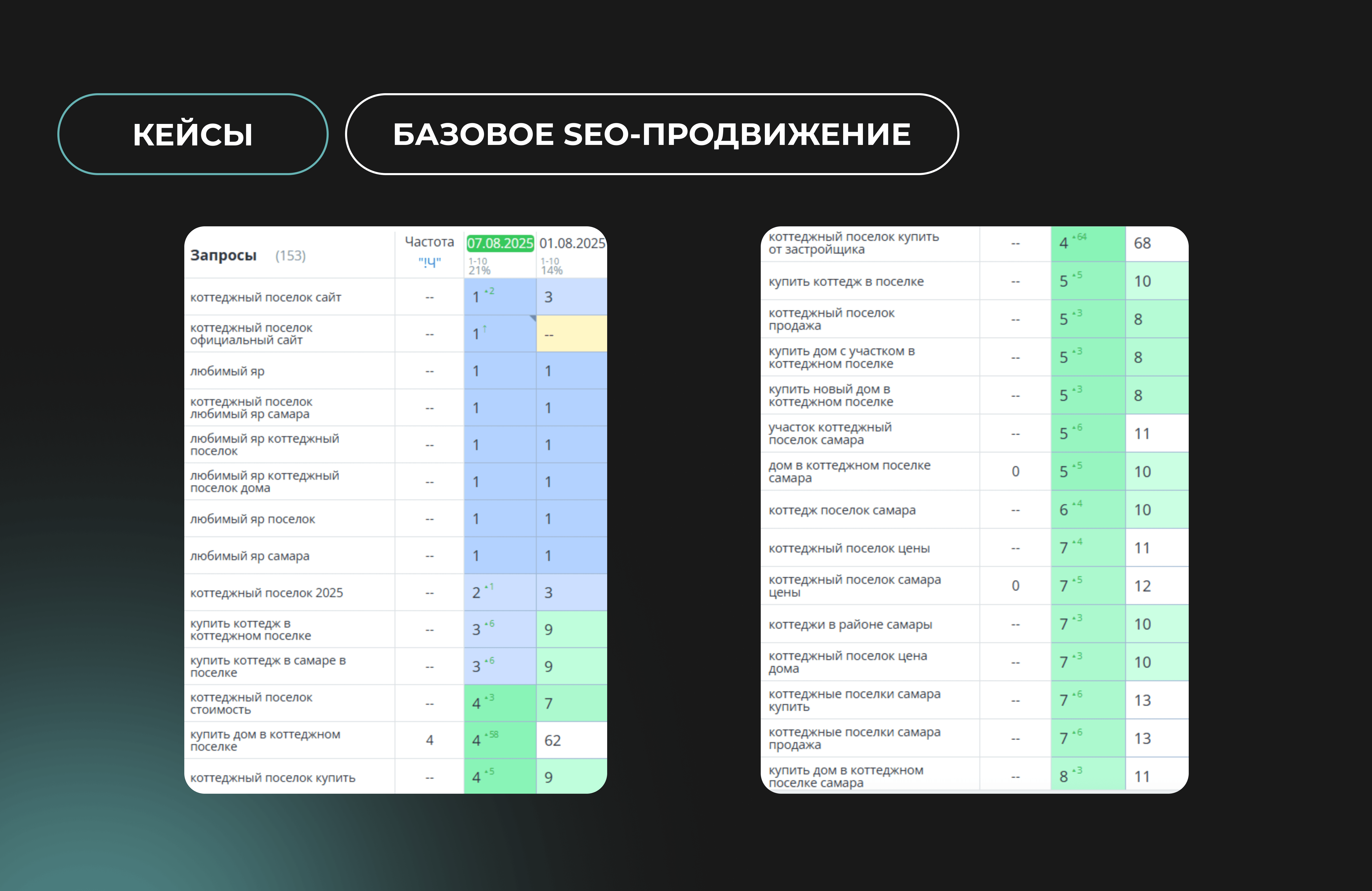 Сайт вышел в ТОП-5 и ТОП-10 по ряду высокочастотных запросов, что значительно усилило его присутствие в поисковой выдаче.